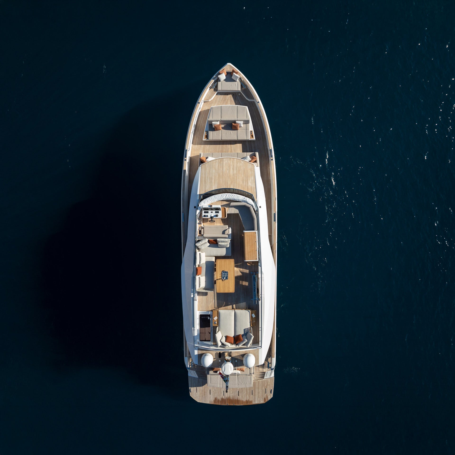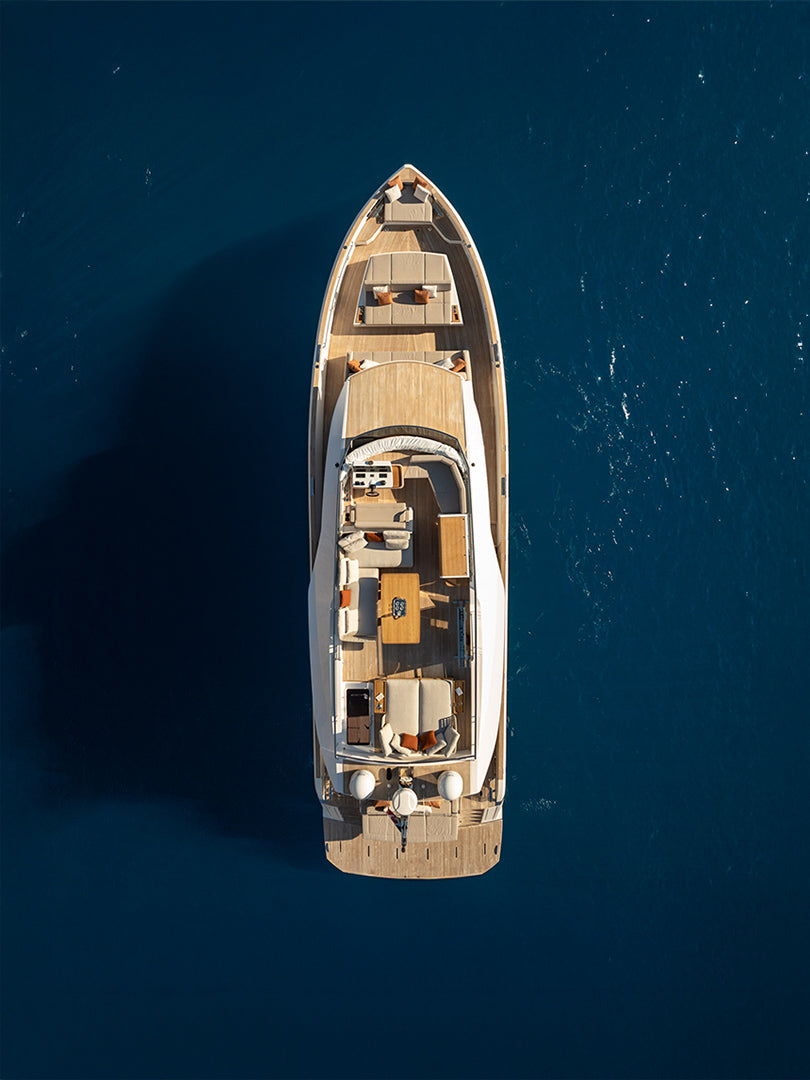 Designed for those who love spending long cruising periods in utmost comfort and desire spacious, welcoming interiors, the indoor layout prioritizes maximum livability. The entire interior area of the main deck is dedicated to a bright open space, with the kitchen and dining area aft, featuring two large French windows, and the lounge area at the bow. The lower deck is entirely focused on privacy, with 5 bathrooms and 4 cabins: the owner’s and VIP cabins, accessible via the central staircase, and two additional double cabins for guests, with access via the forward staircase. All the spaces exude a delicate atmosphere of luxury, with high levels of customization. Whether teak, walnut, or oak, the owner can choose the finishes they prefer to complete the palette of fine materials that define every space with understated elegance.