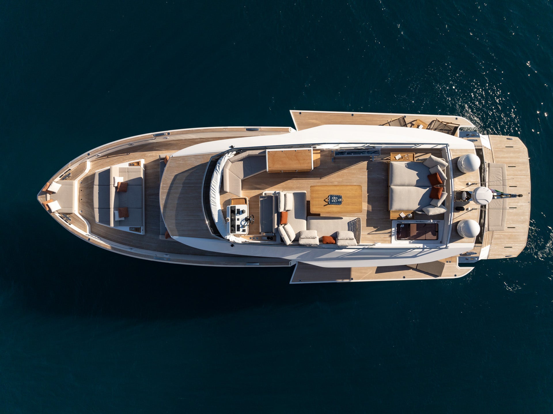 The dual fold-down bulwarks extend the cockpit area dedicated to open-air living, which, along with the aft swim platform, spans over 61 square meters.