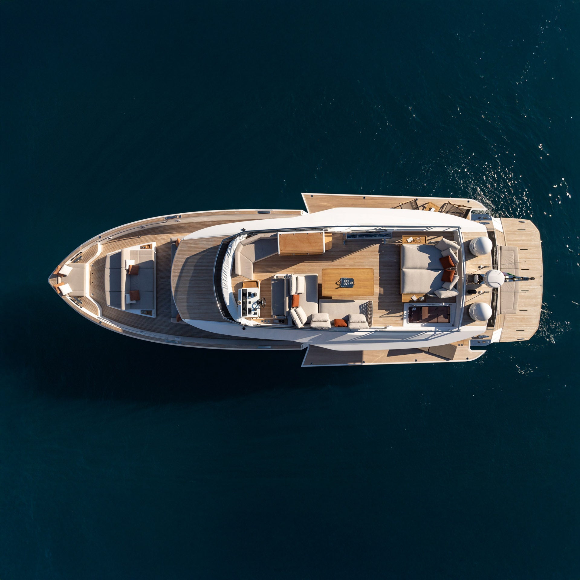 Spanning 27 square meters, the flybridge adds extra living and dining spaces, complementing those on the main deck.