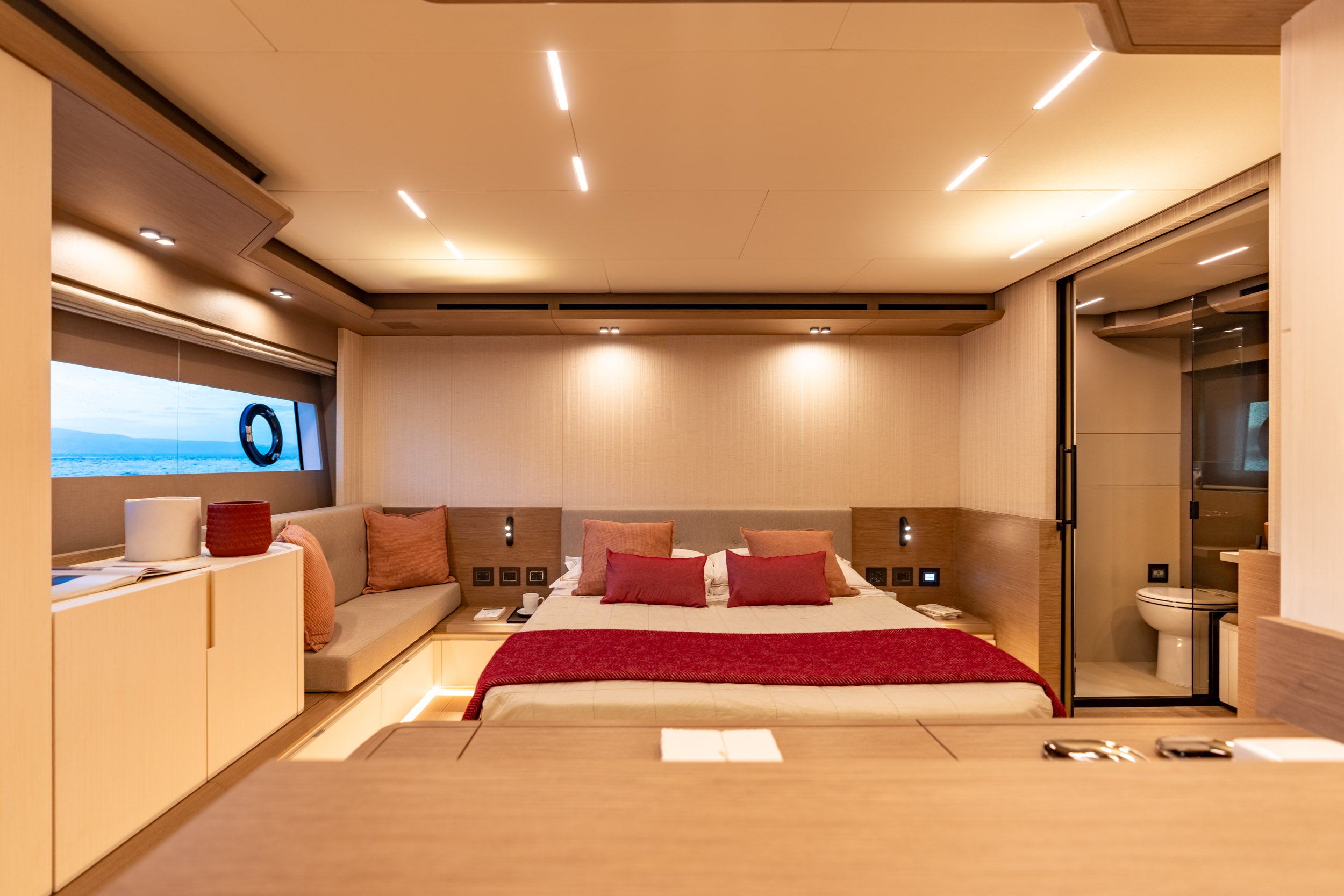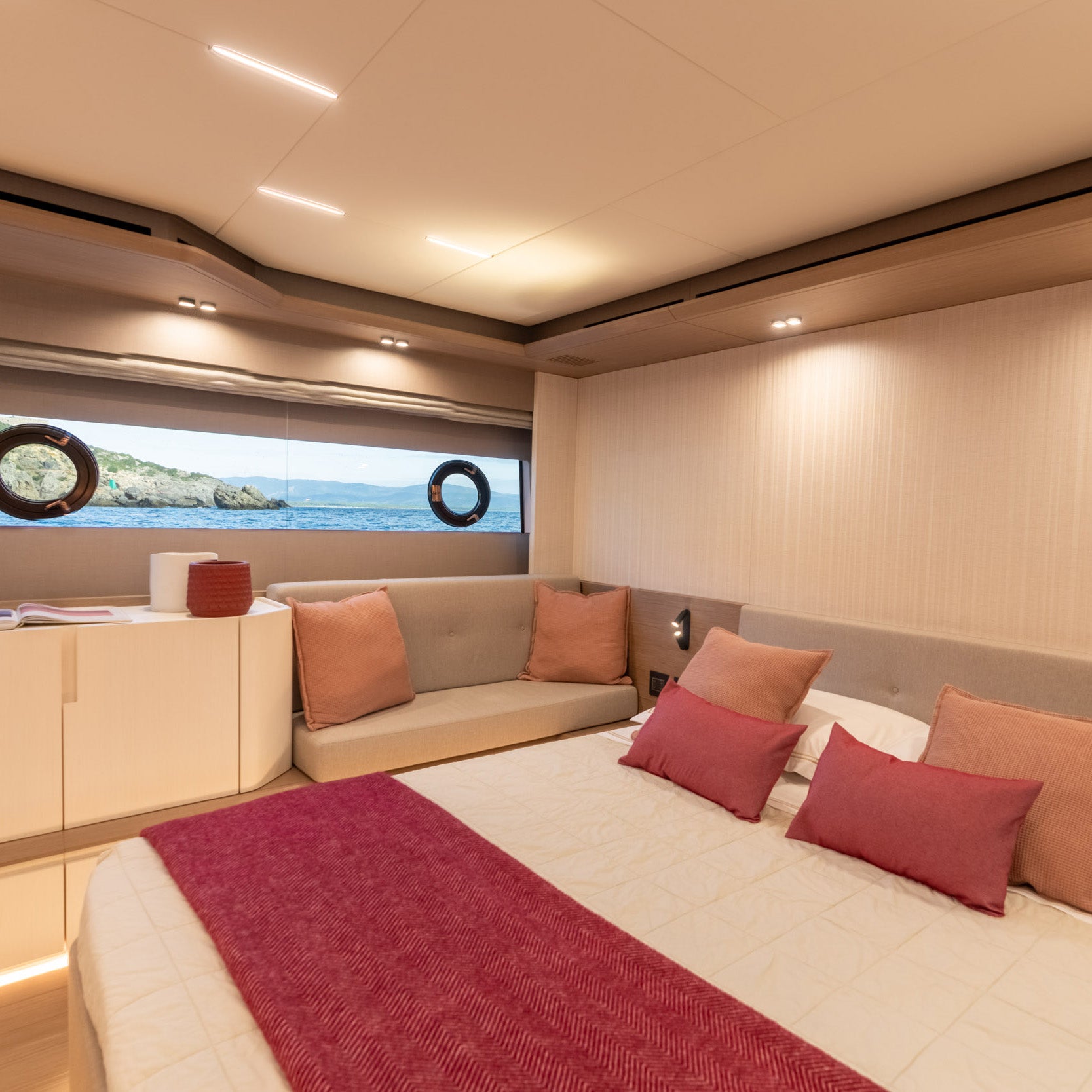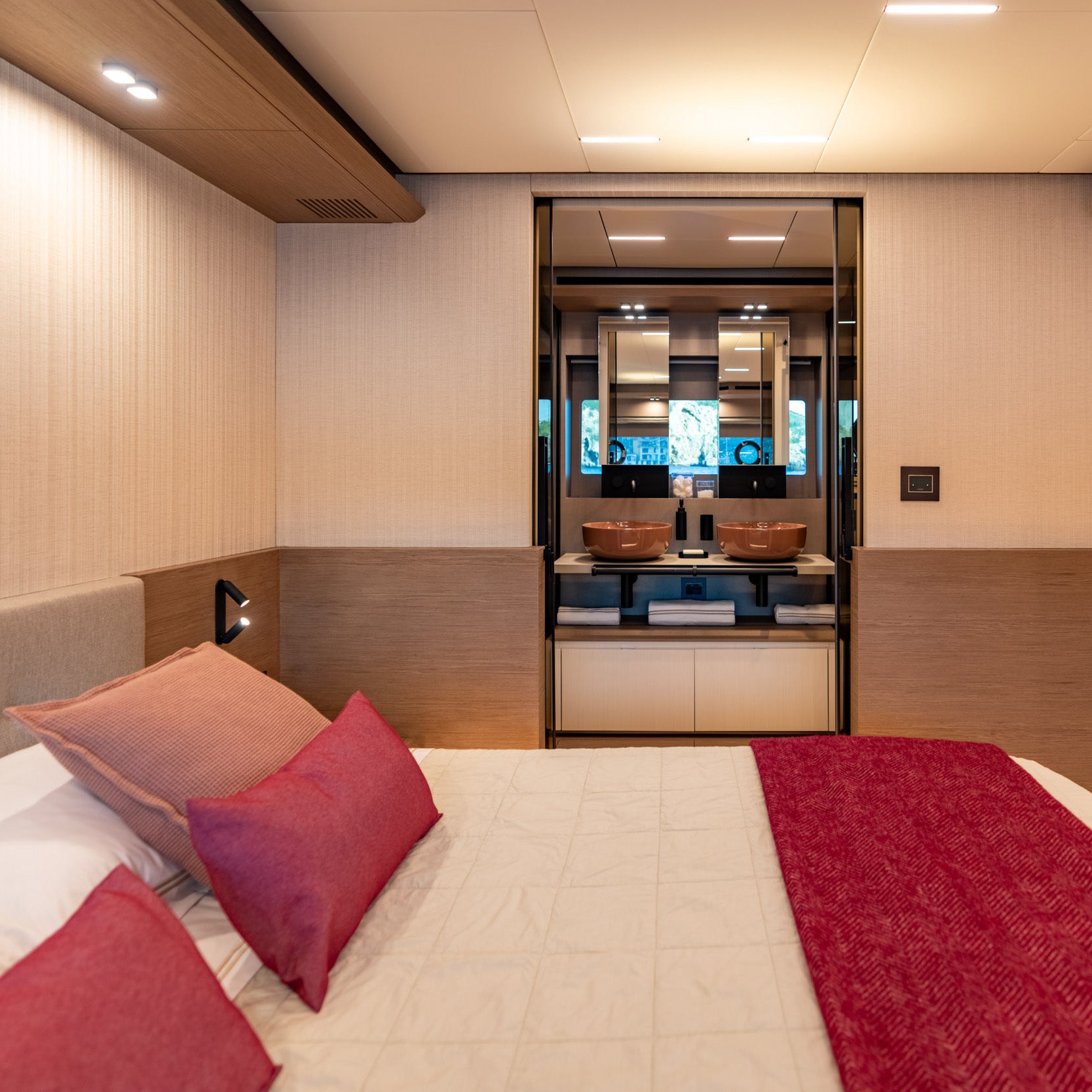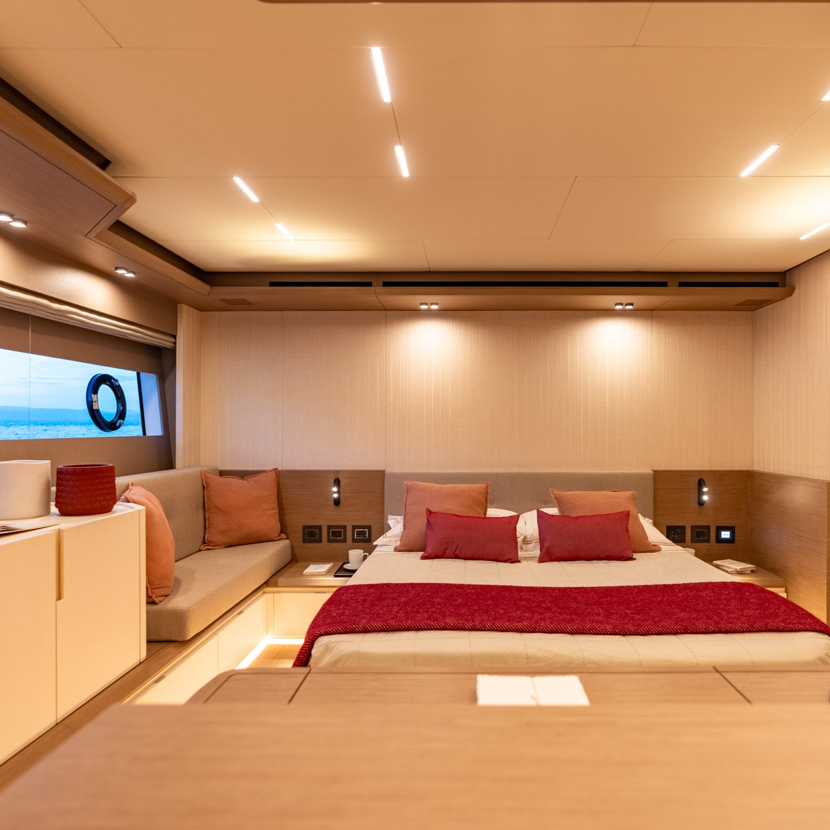 The centrally positioned owner’s suite offers a spacious and welcoming personal area, making the most of the maximum beam of the hull.