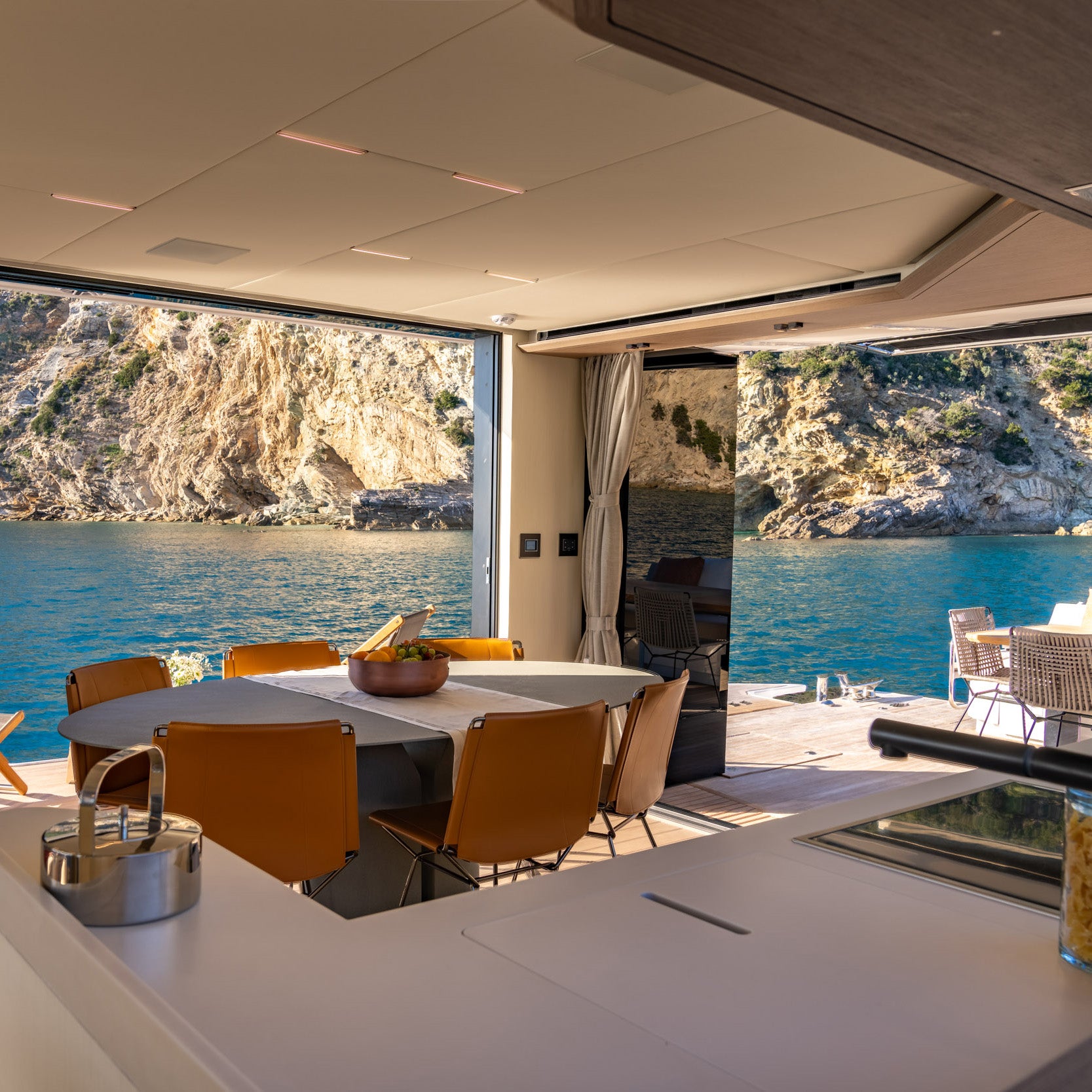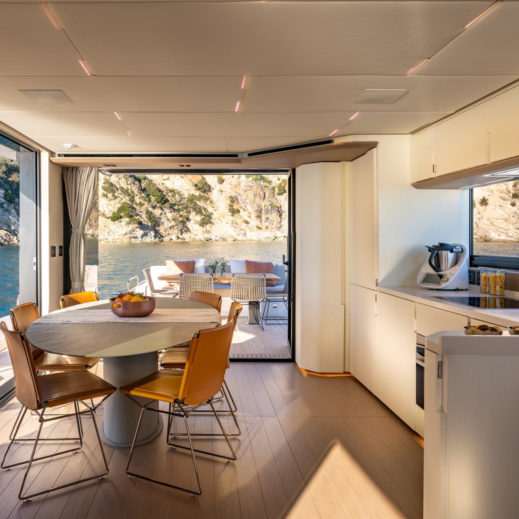 The kitchen, located aft on the main deck, with a table seating 6-8 people, is seamlessly connected to the outdoor spaces.