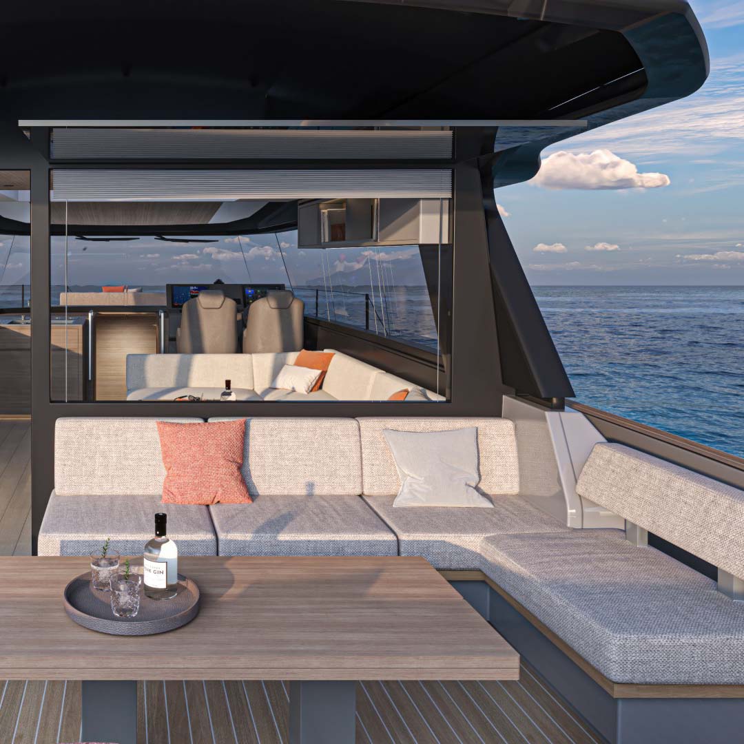 Aft, the low-profile volumes minimize visual impact, preserving an unobstructed view of the sea.