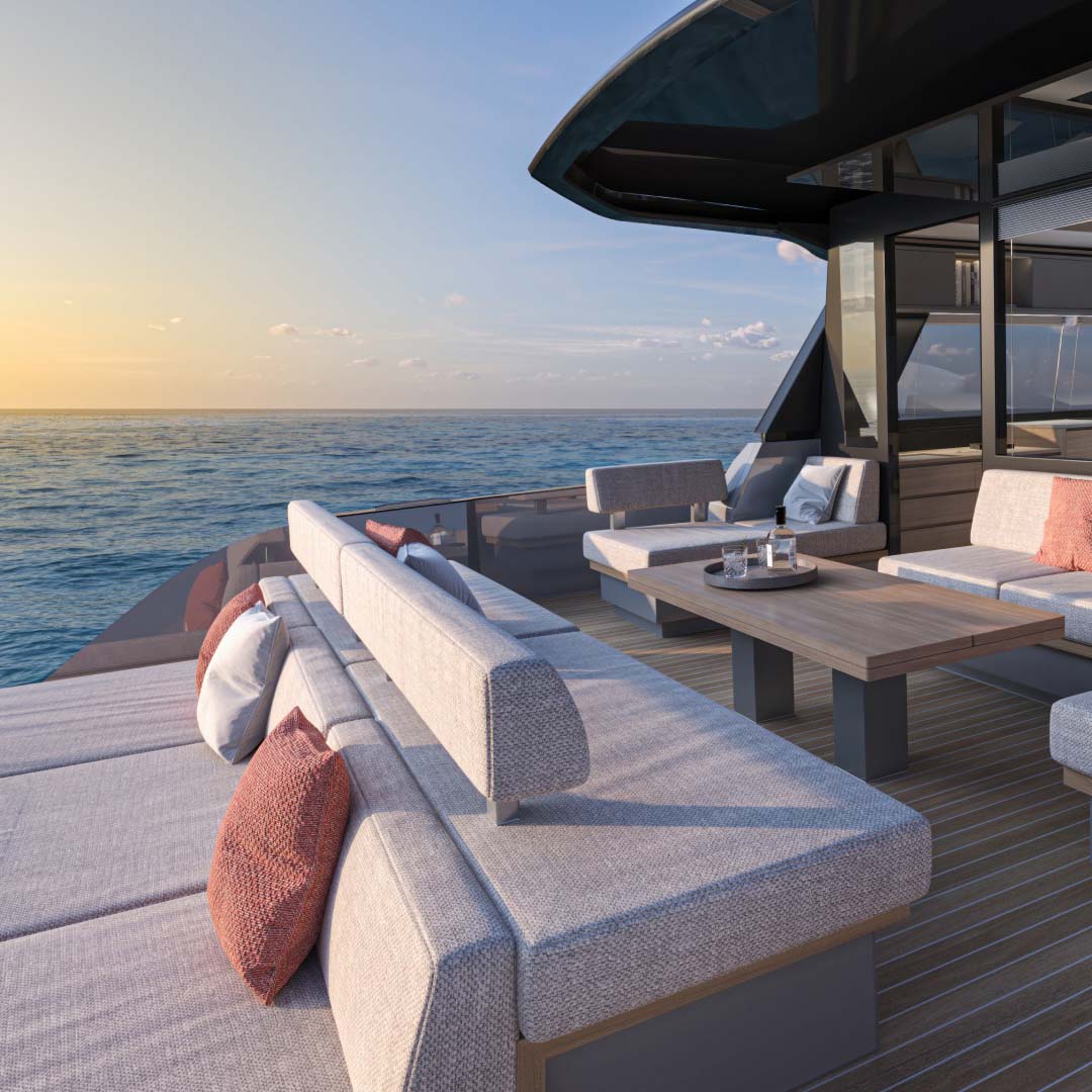 Connection with the sea is the defining feature of this highly versatile yacht. Wide panoramic windows and the dinette’s retractable roof create a seamless flow between the landscape and the exterior lounge, which, in turn, transitions into the large overhanging sunpad above the swim platform. The main deck at the bow offers an additional outdoor lounge area, featuring a large sunpad and a forward-facing convertible sofa. The Pardo GT65 also includes a tender garage – an amenity typically found on larger yachts –capable of accommodating a tender up to 3 meters in size.
