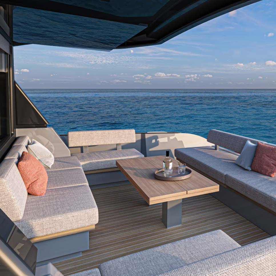 The Pardo GT65, the third model added to the crossover fleet, fulfills the promises behind the GT range's design philosophy: preserving the sporty performance, iconic design, and elegance typical of the walkaround models while offering enhanced onboard livability through larger and more flexible spaces. At the heart of this yacht’s development is the dinette, which perfectly embodies the versatile philosophy of the GT65. This indoor space, located on the main deck, is wide and adaptable, designed to be easily enclosed for privacy or opened to connect seamlessly with the sea. Both the bow and stern outdoor areas are crafted for maximum enjoyment of summer days, providing easy access between sunbathing zones, living spaces, and the swim platform.