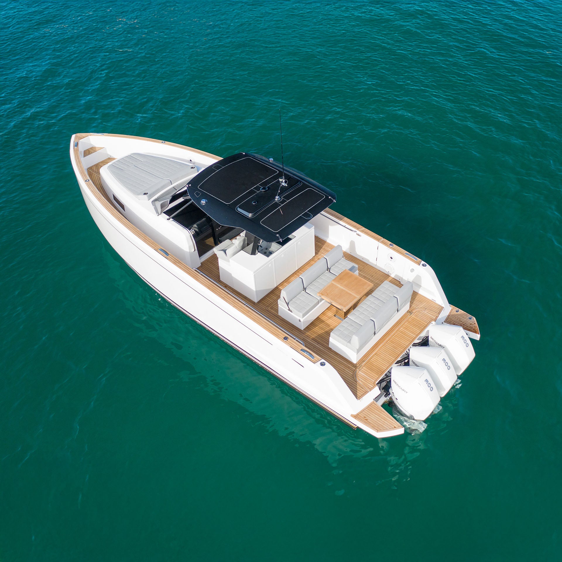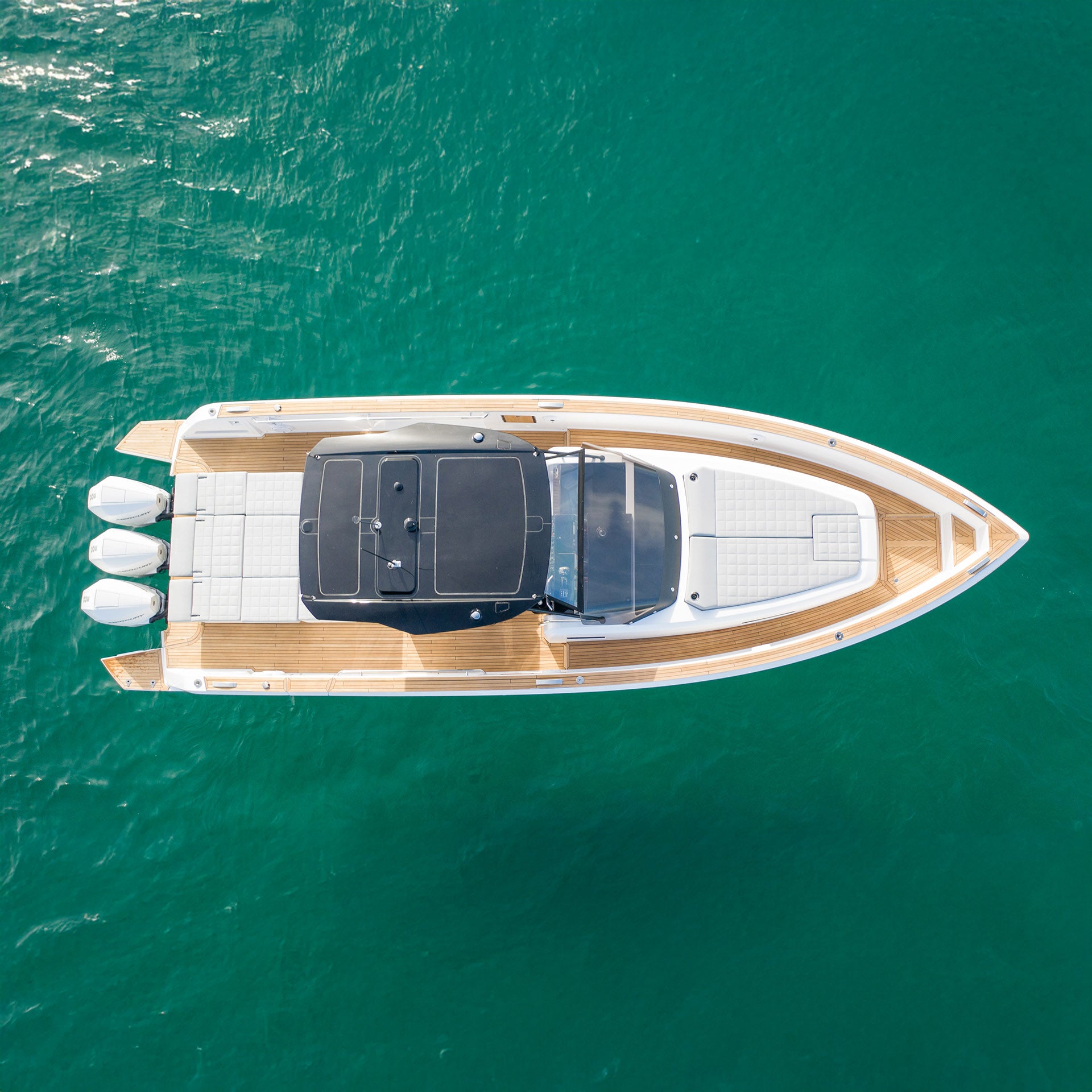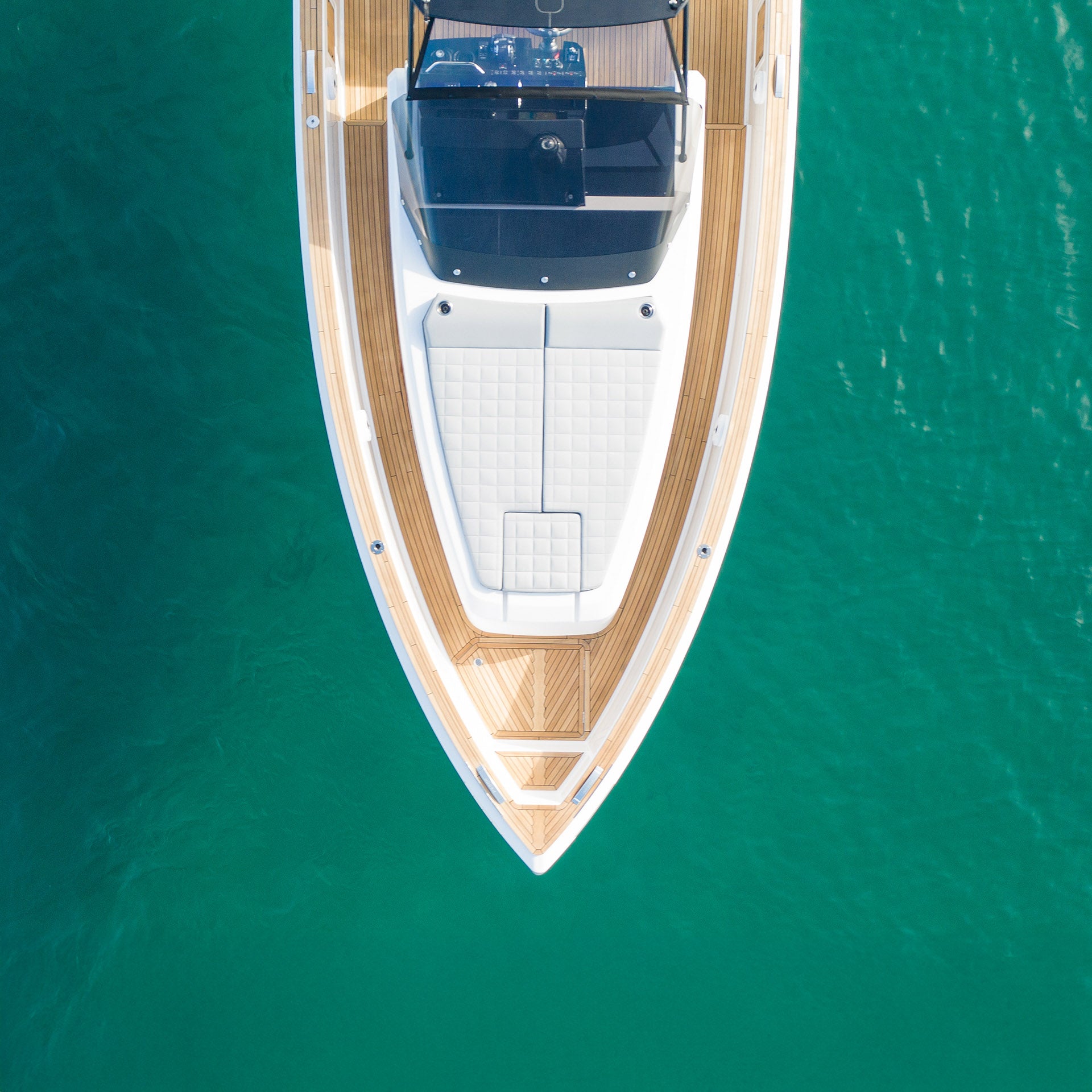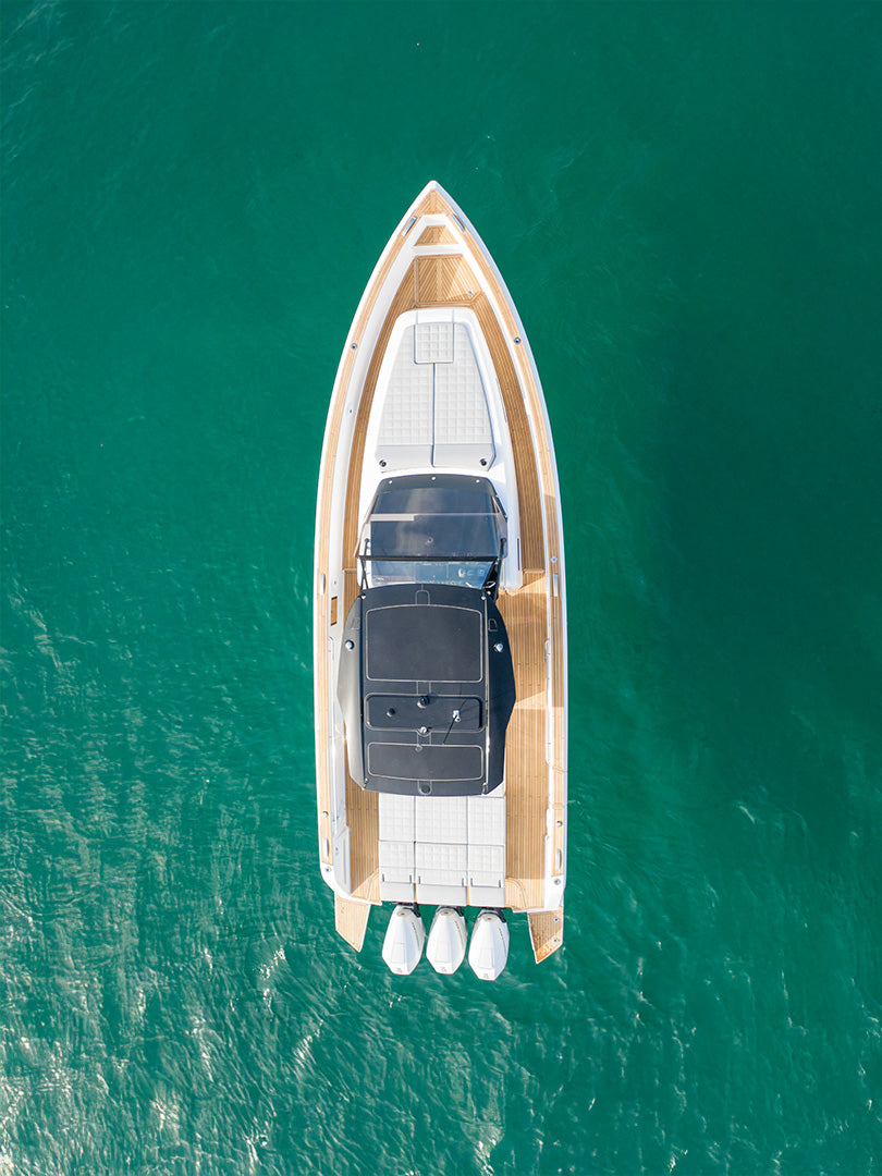 The deck plan maintains the walkaround configuration, ensuring versatile spaces for enjoying the sea at any time of the day. The central cockpit, multifunctional, quickly transforms from a living area for 6/8 people to an additional large sunbathing area. The fixed T-top, made of lightweight and durable carbon fiber, protects the dining area and helm, with the possibility of extending the shade towards the stern thanks to an integrated retractable electric bimini. The outboard engines, positioned at the stern, not only free up additional space on board but also provide an even more dynamic aesthetic and unparalleled propulsive thrust.
