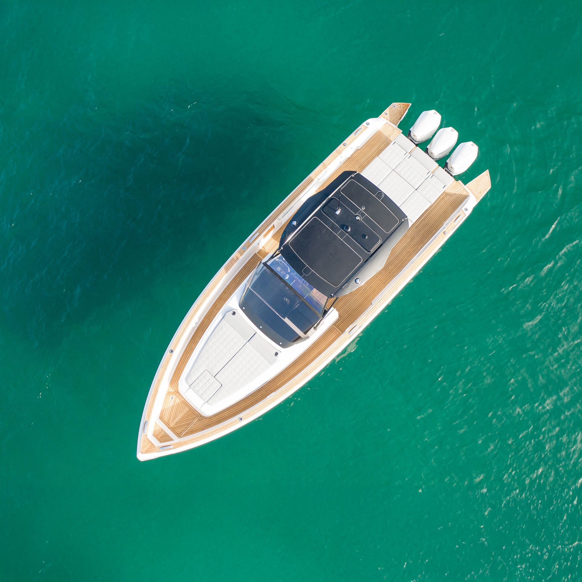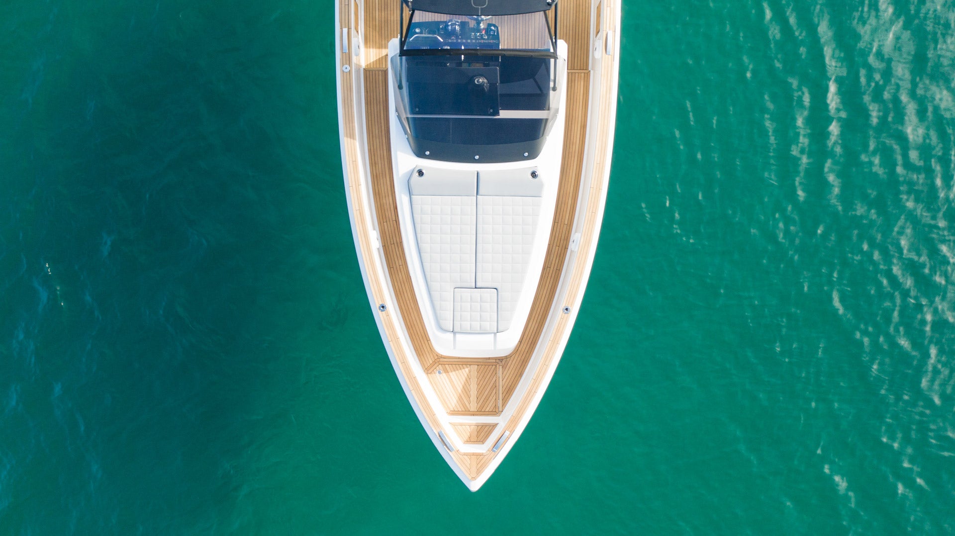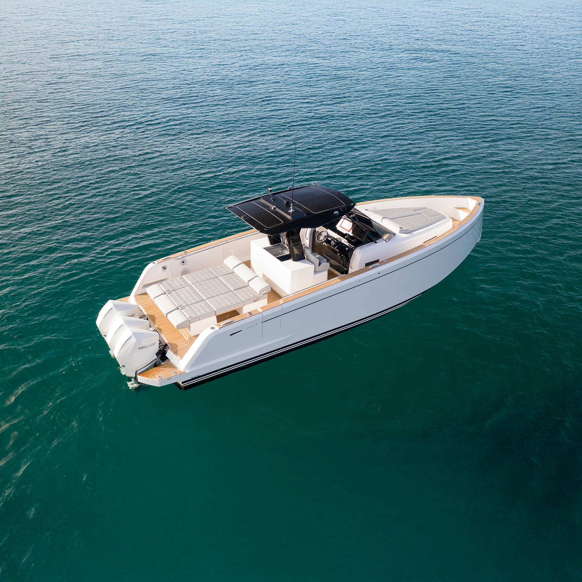 The deck plan maintains the walkaround configuration, ensuring versatile spaces for enjoying the sea at any time of the day. The central cockpit, multifunctional, quickly transforms from a living area for 6/8 people to an additional large sunbathing area. The fixed T-top, made of lightweight and durable carbon fiber, protects the dining area and helm, with the possibility of extending the shade towards the stern thanks to an integrated retractable electric bimini. The outboard engines, positioned at the stern, not only free up additional space on board but also provide an even more dynamic aesthetic and unparalleled propulsive thrust.