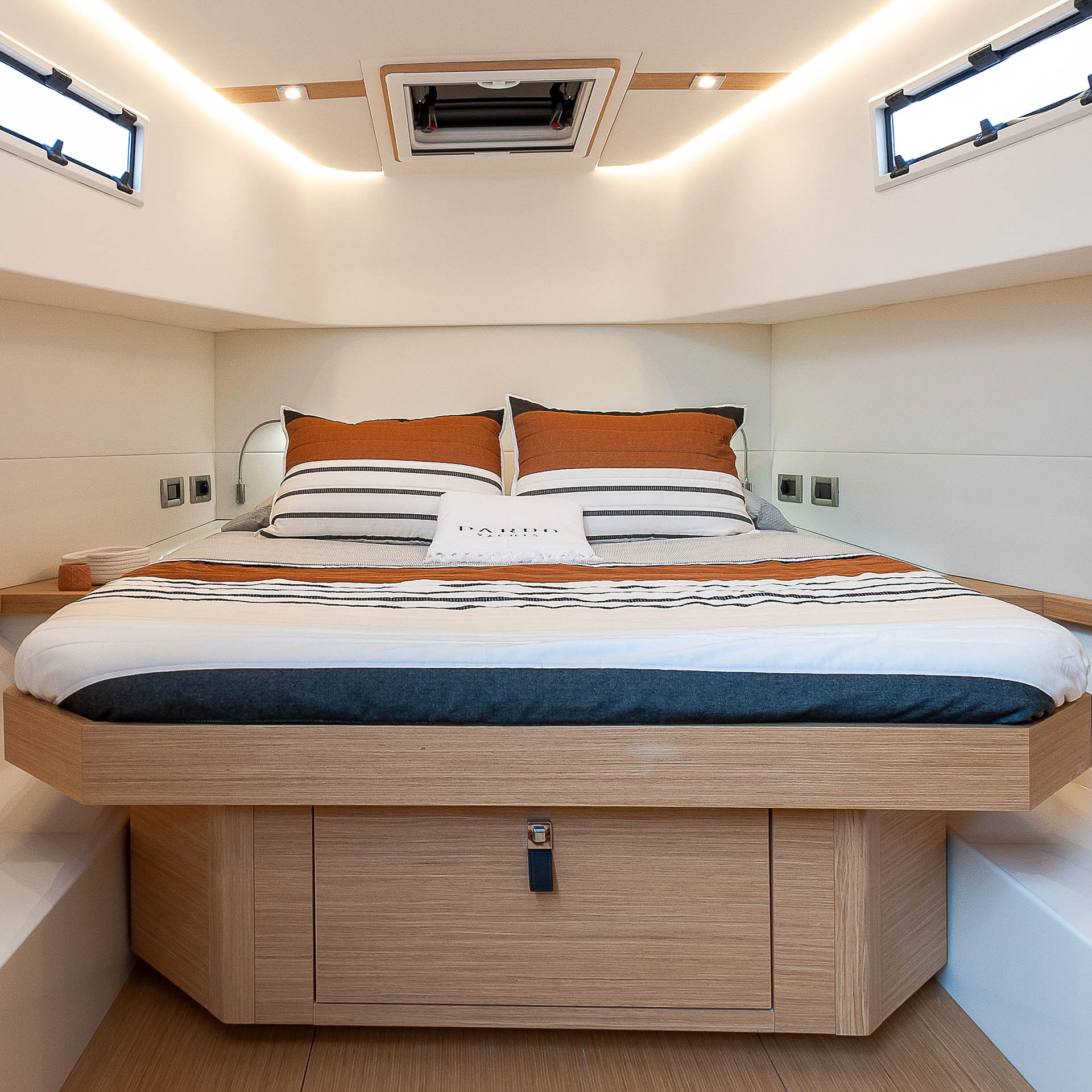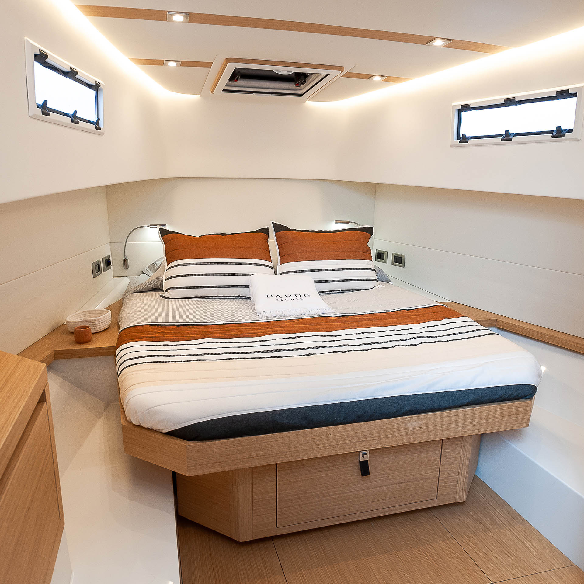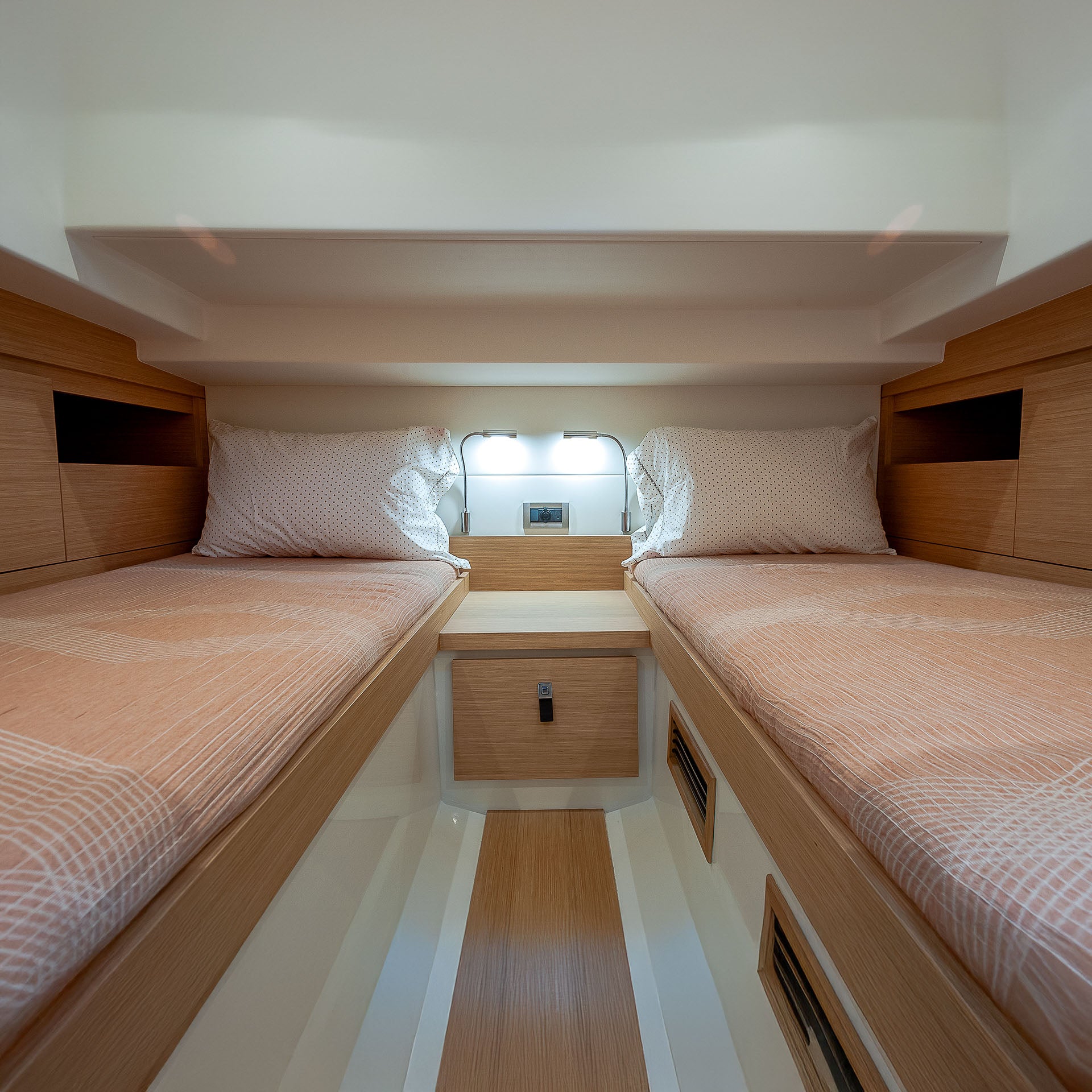The interiors of the P38 Outboard maintain the flexibility and minimalist style that distinguish the model. Two layouts are available: a standard configuration with a double cabin and bathroom, or a layout with a second aft cabin with twin beds. Thanks to the choice of outboards, the interior spaces gain additional livability, with volumes optimized for excellent comfort on a 38-foot boat.