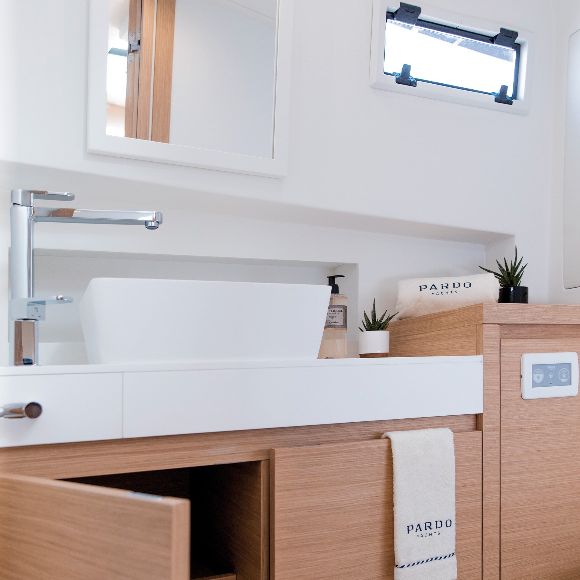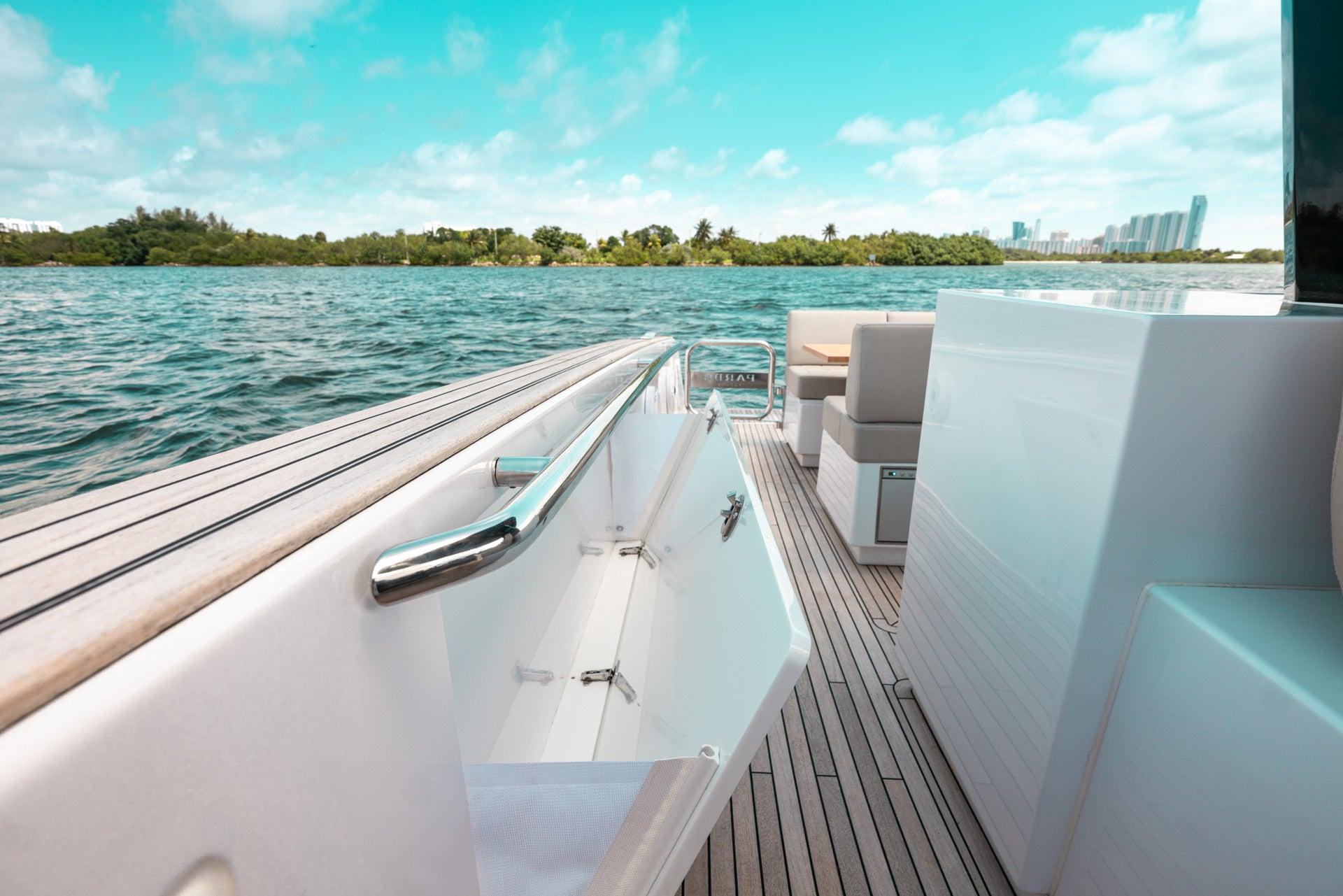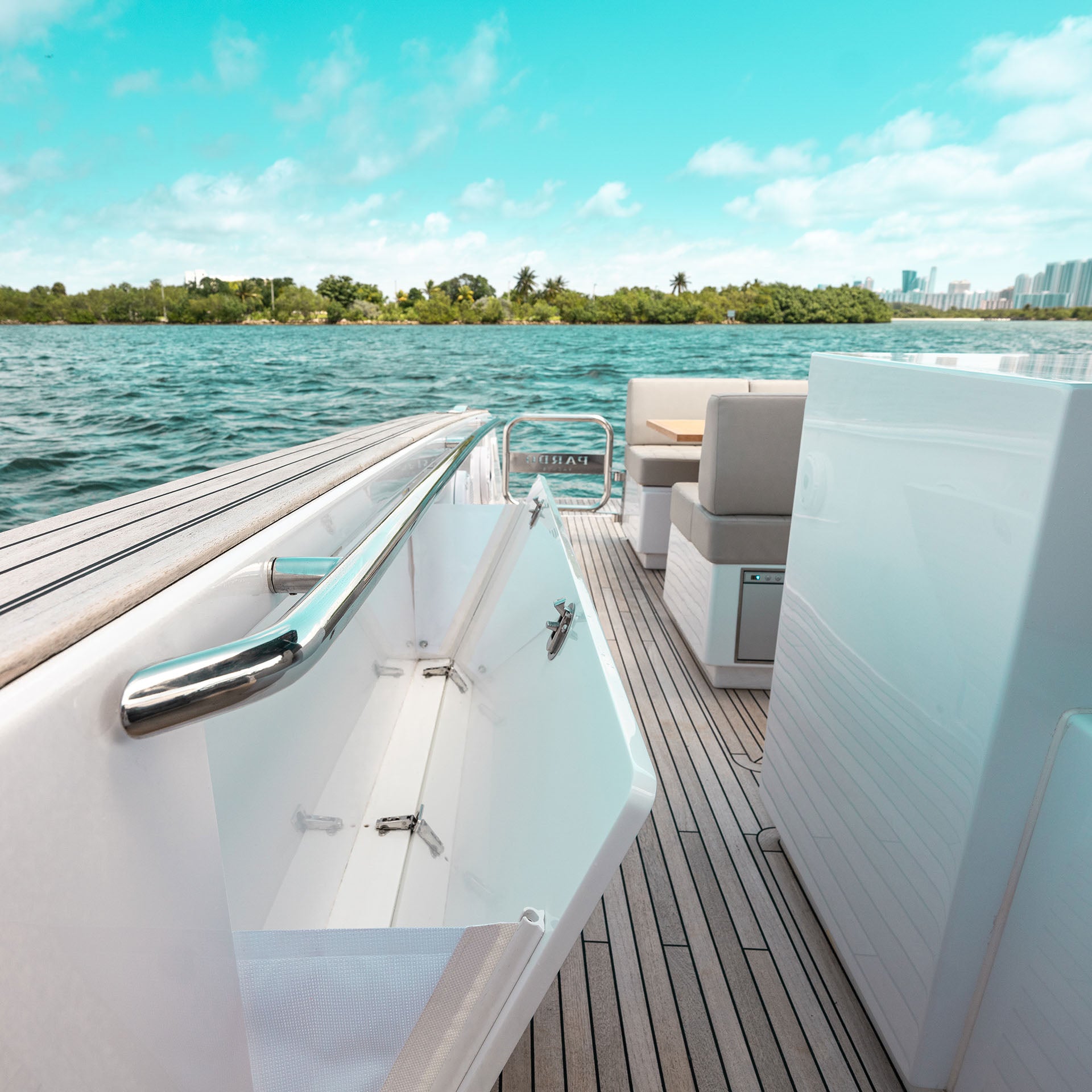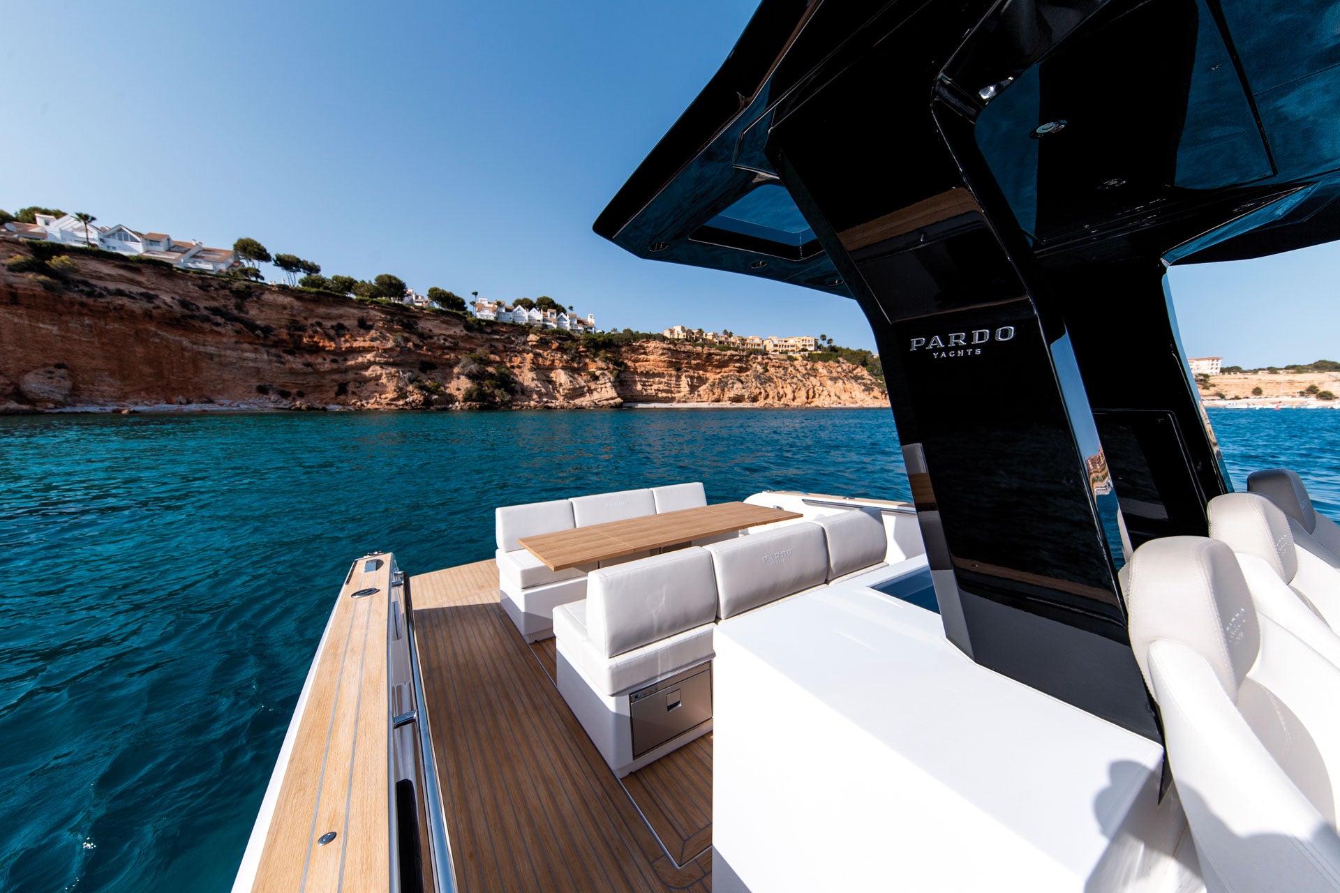On the Pardo 38, every detail is designed with functionality in mind, including the folding bulwark, which adds extra space by doubling as a storage compartment.