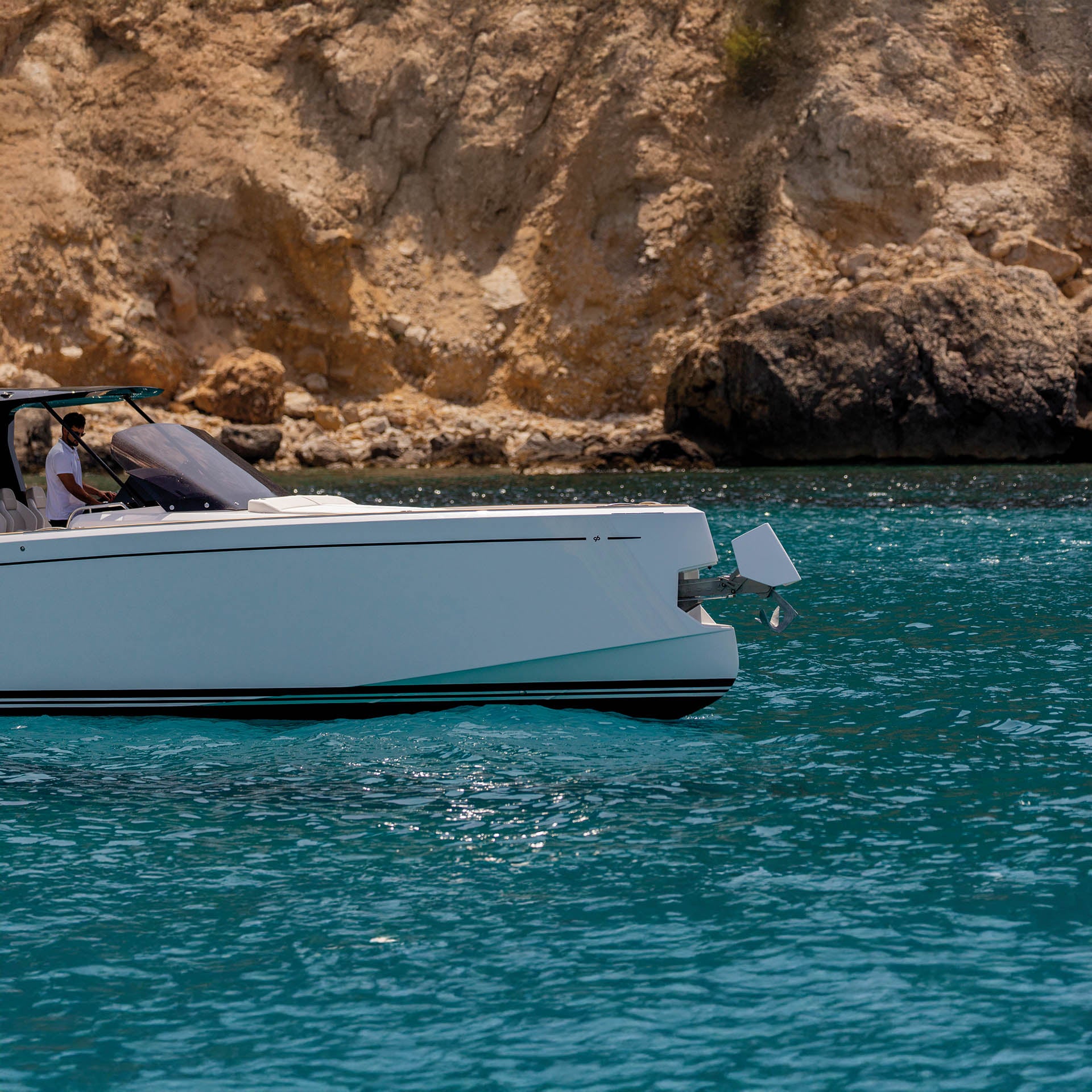 The flexible architecture of the outdoor design is seamlessly reflected indoors, offering two different layout options. The standard configuration includes a cabin with a double bed and a bathroom, while an alternative layout allows for a second cabin with two single beds in the aft area. The minimalist design and generous volumes ensure exceptional use of space for a 38-foot yacht.