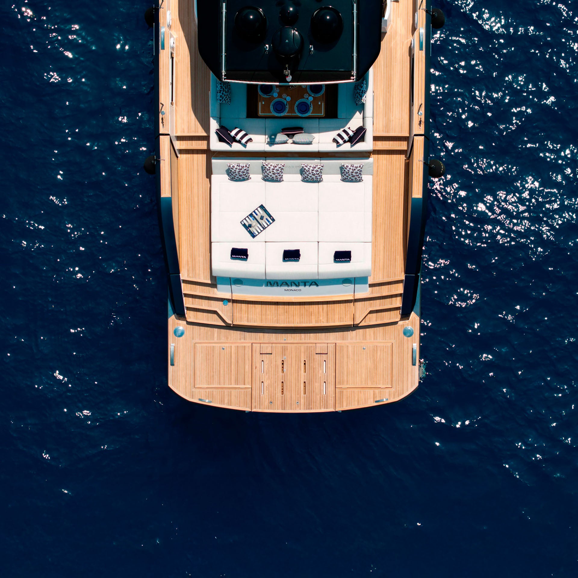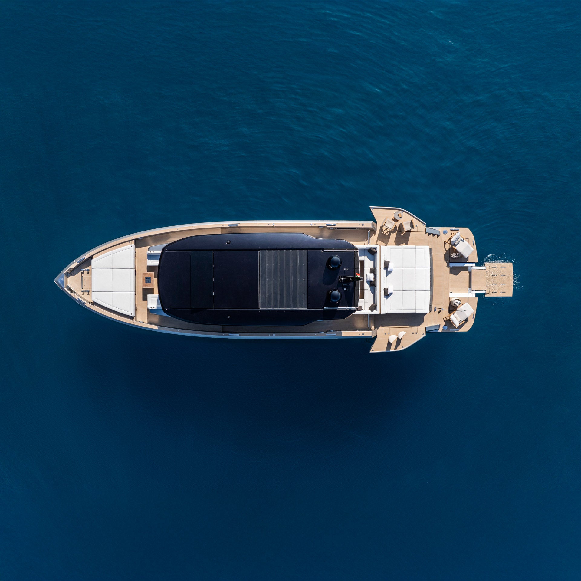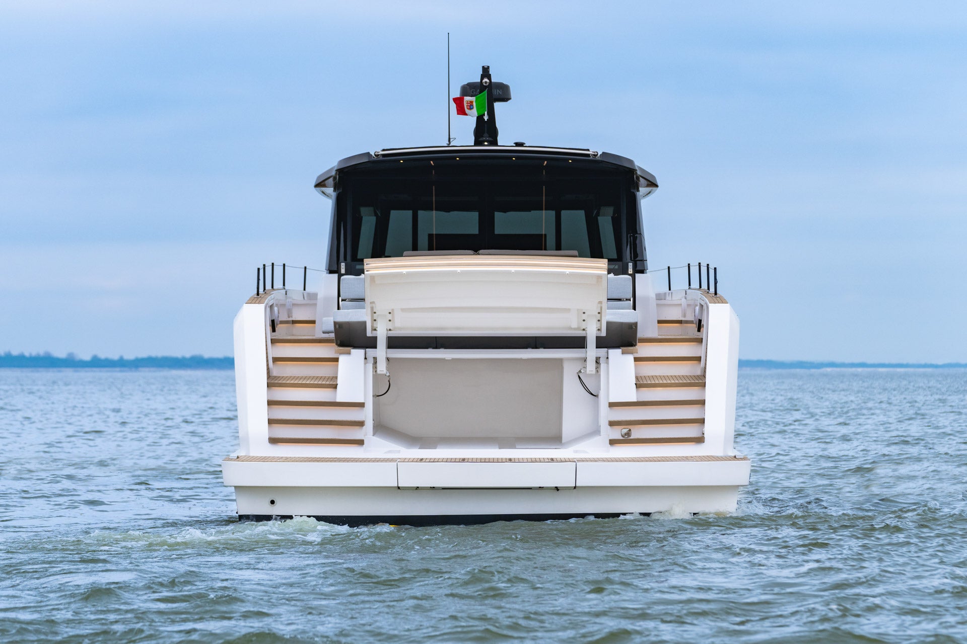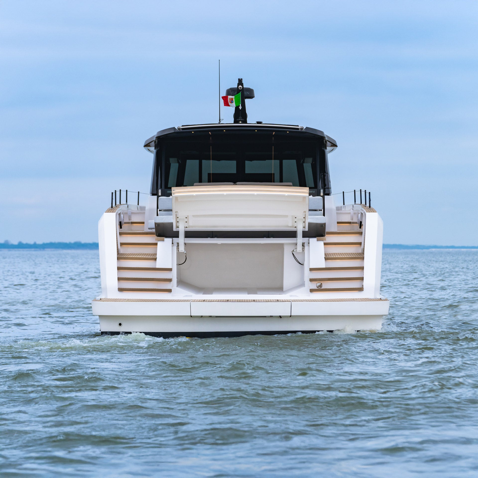 The aft sunpad lifts electrically to reveal a dedicated tender garage, a feature that draws inspiration from the world of superyachts.