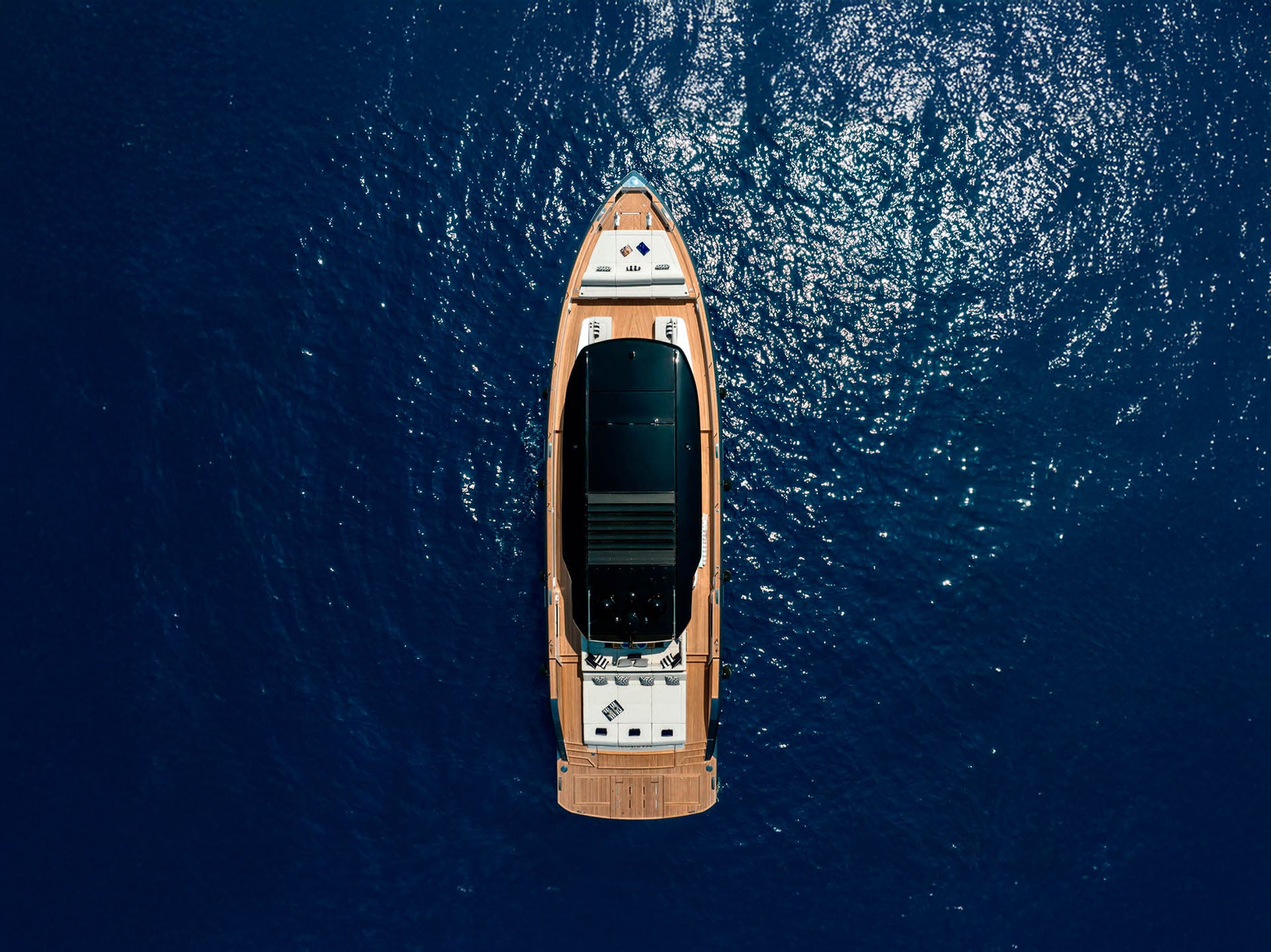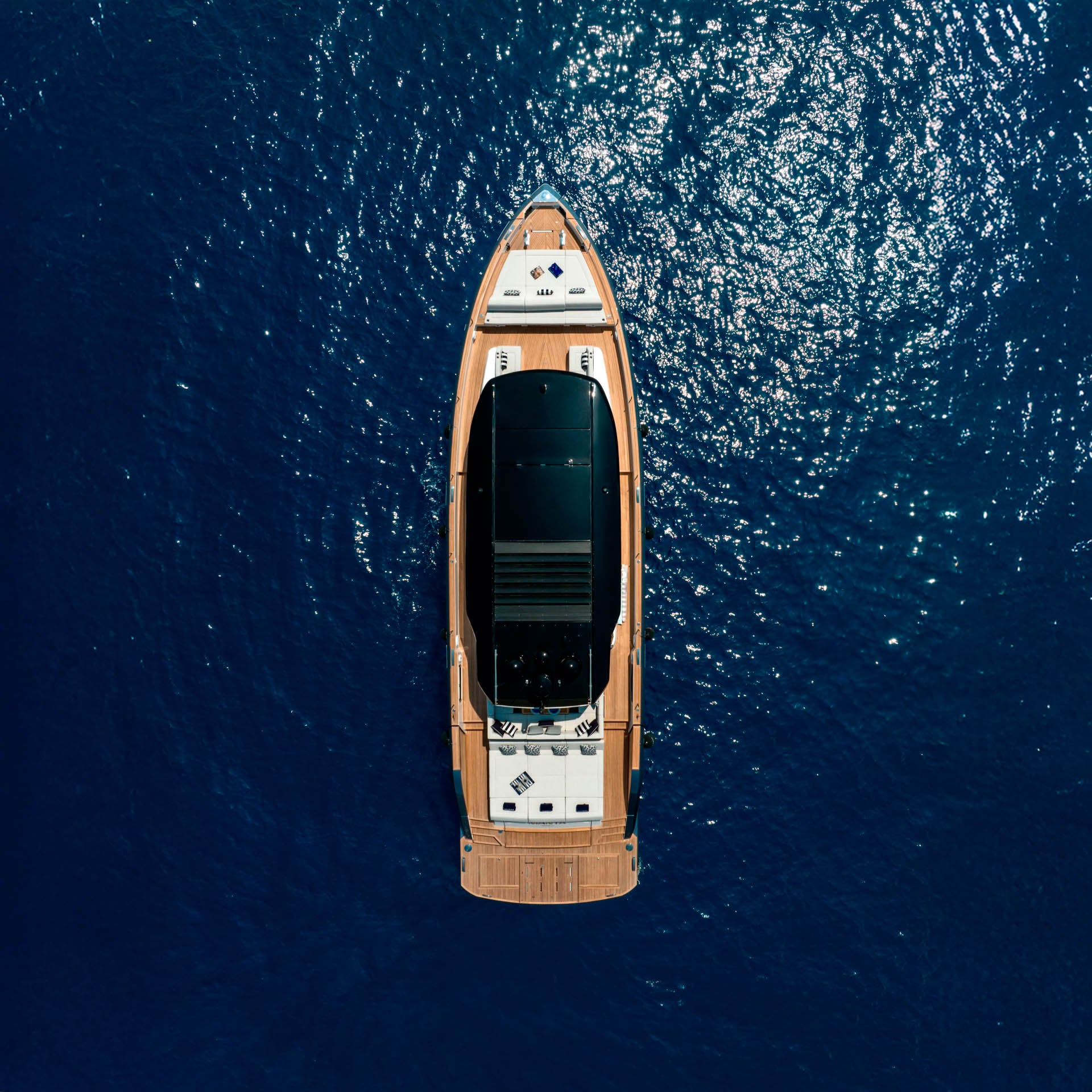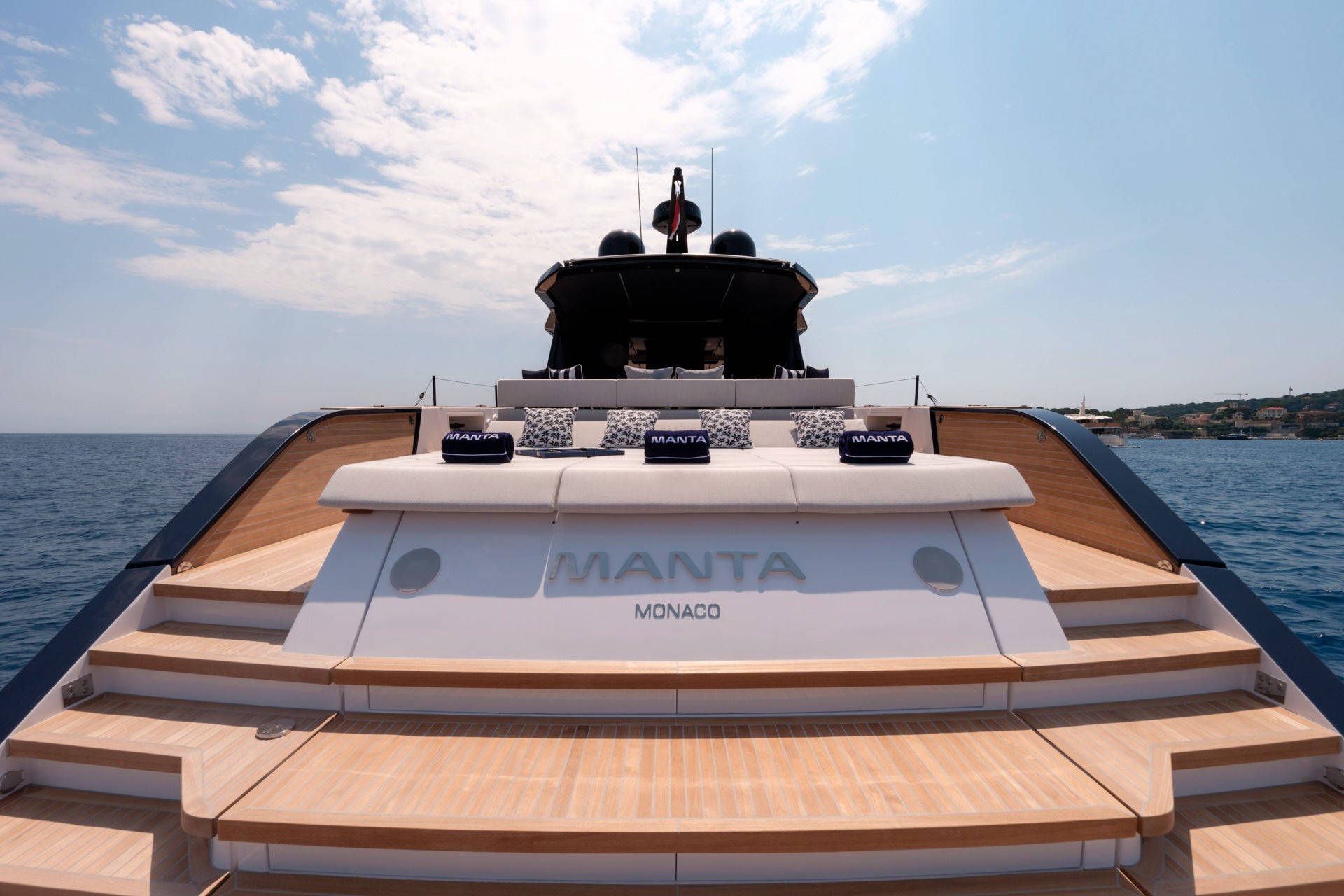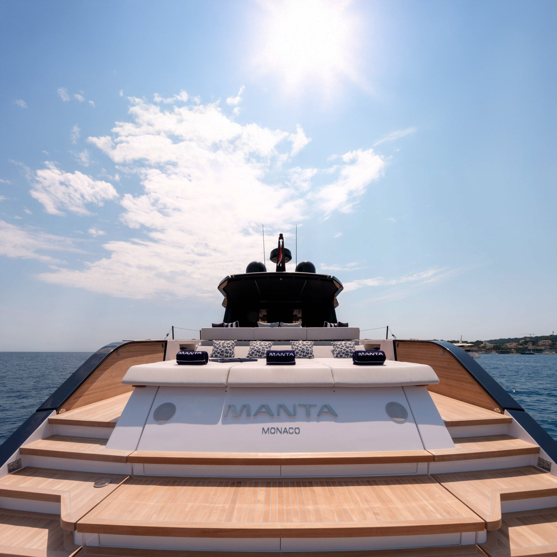 The aft sunpad lifts electrically to reveal a dedicated tender garage, a feature that draws inspiration from the world of superyachts.