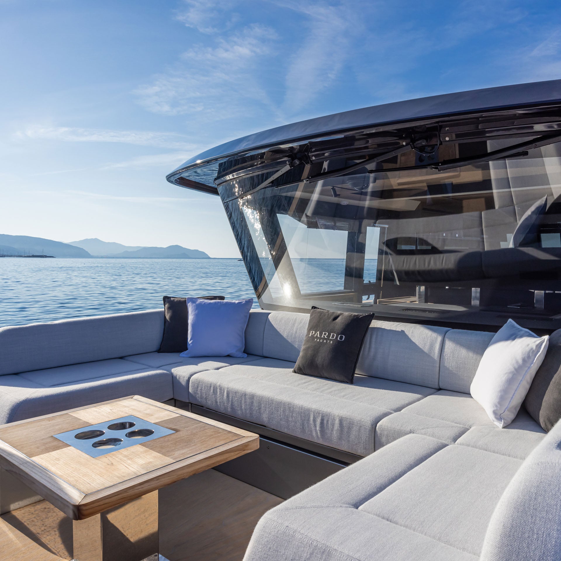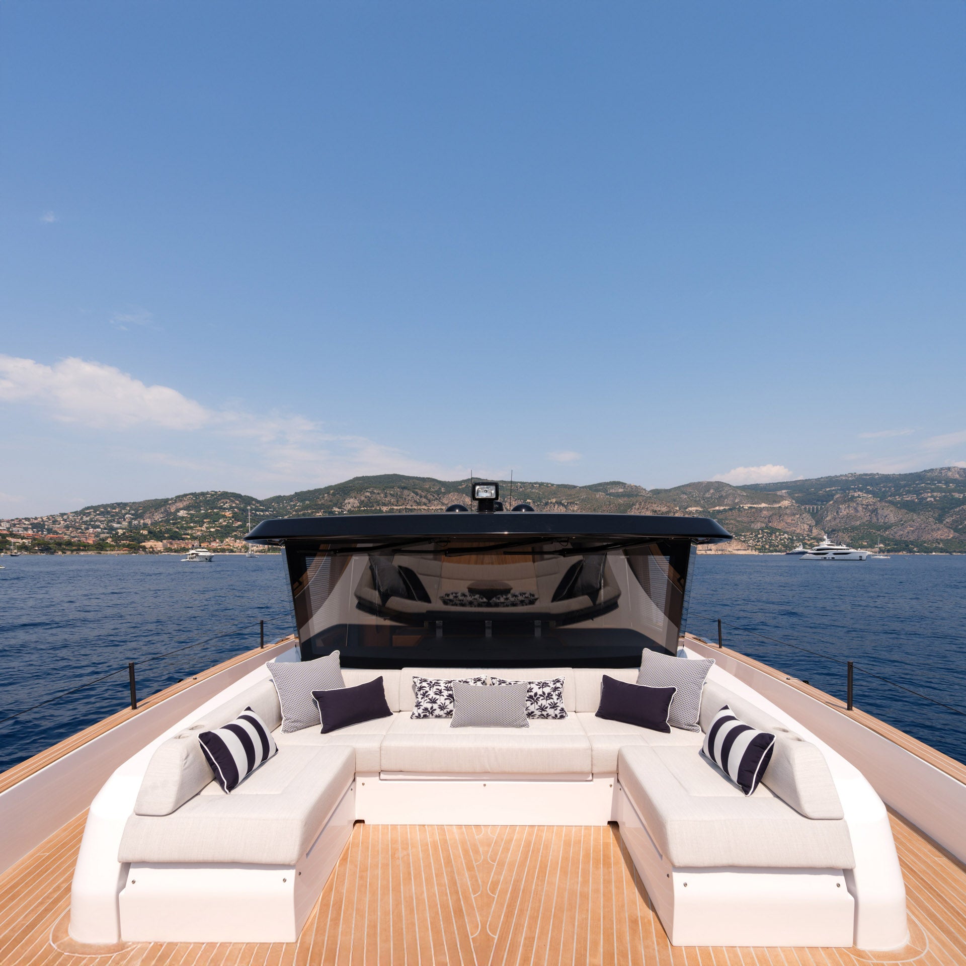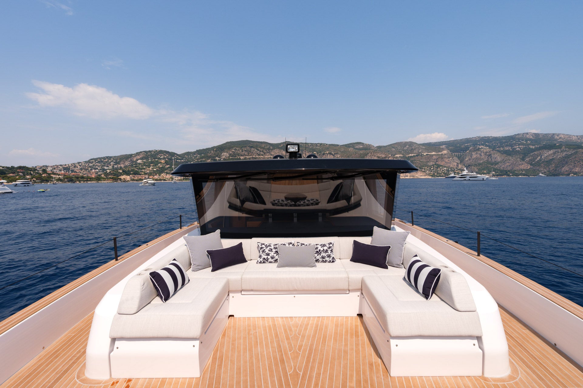 The comfortable seating area can be complemented by a central table, making the bow lounge perfect for breakfasts or aperitifs with a sea view.