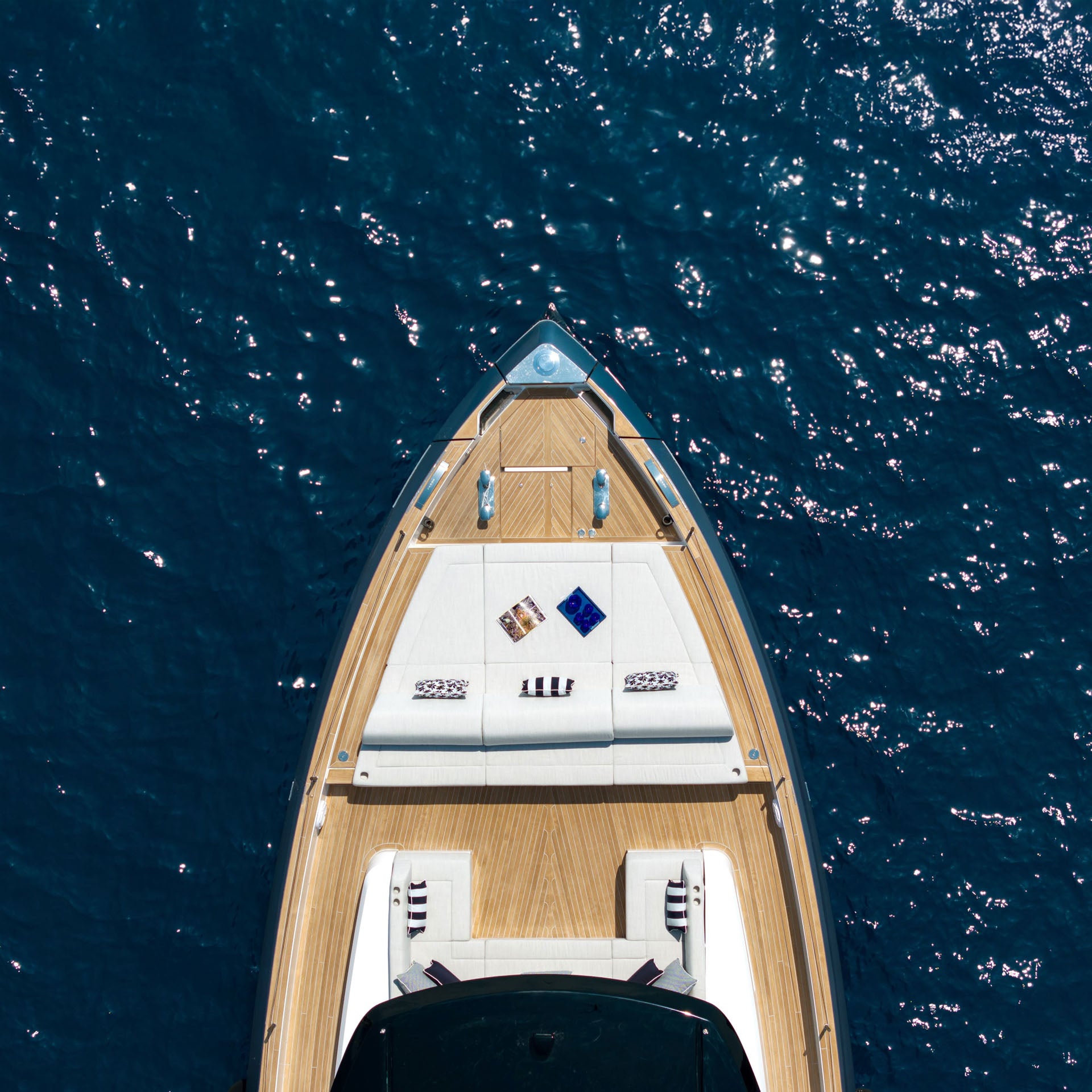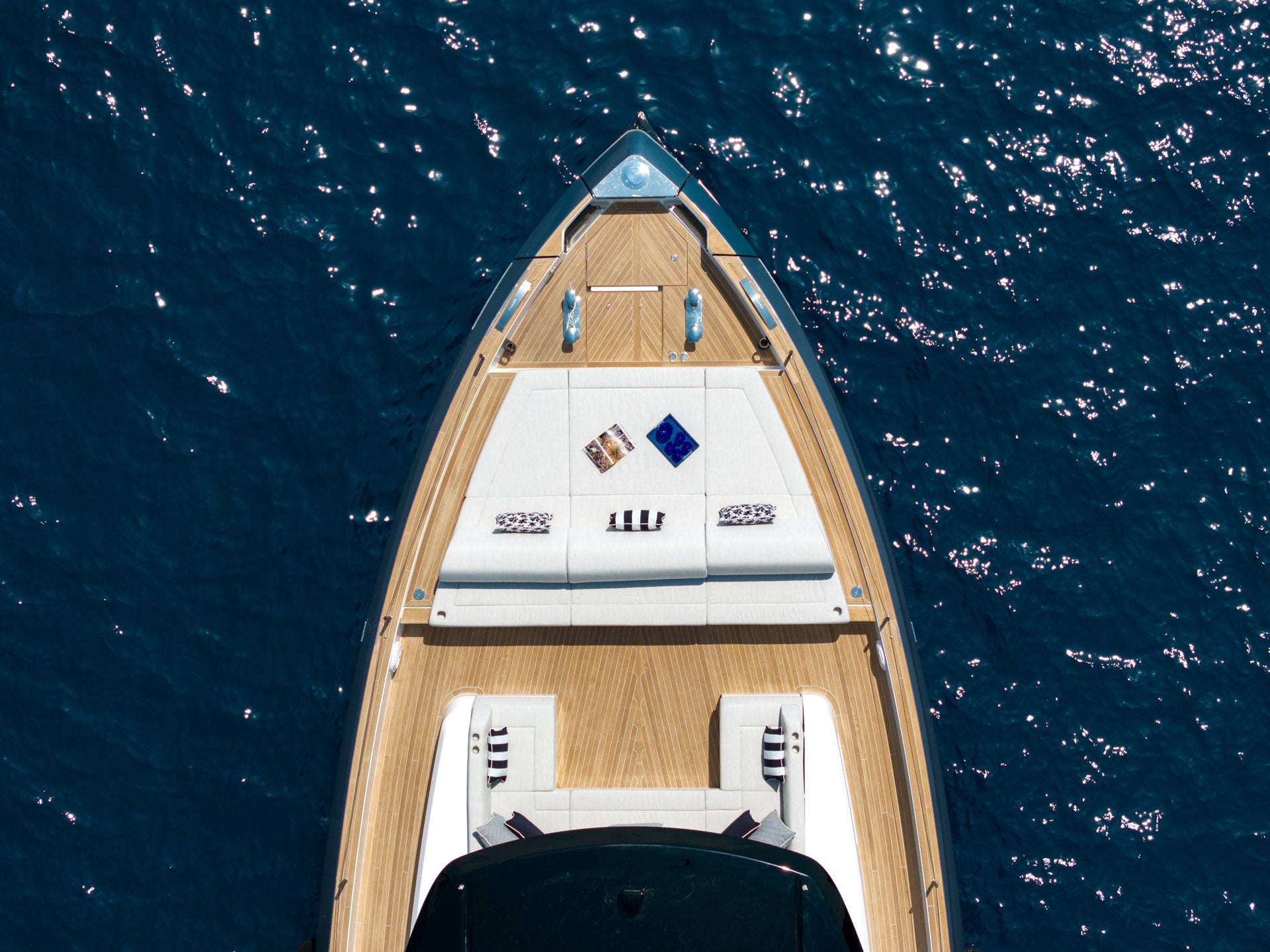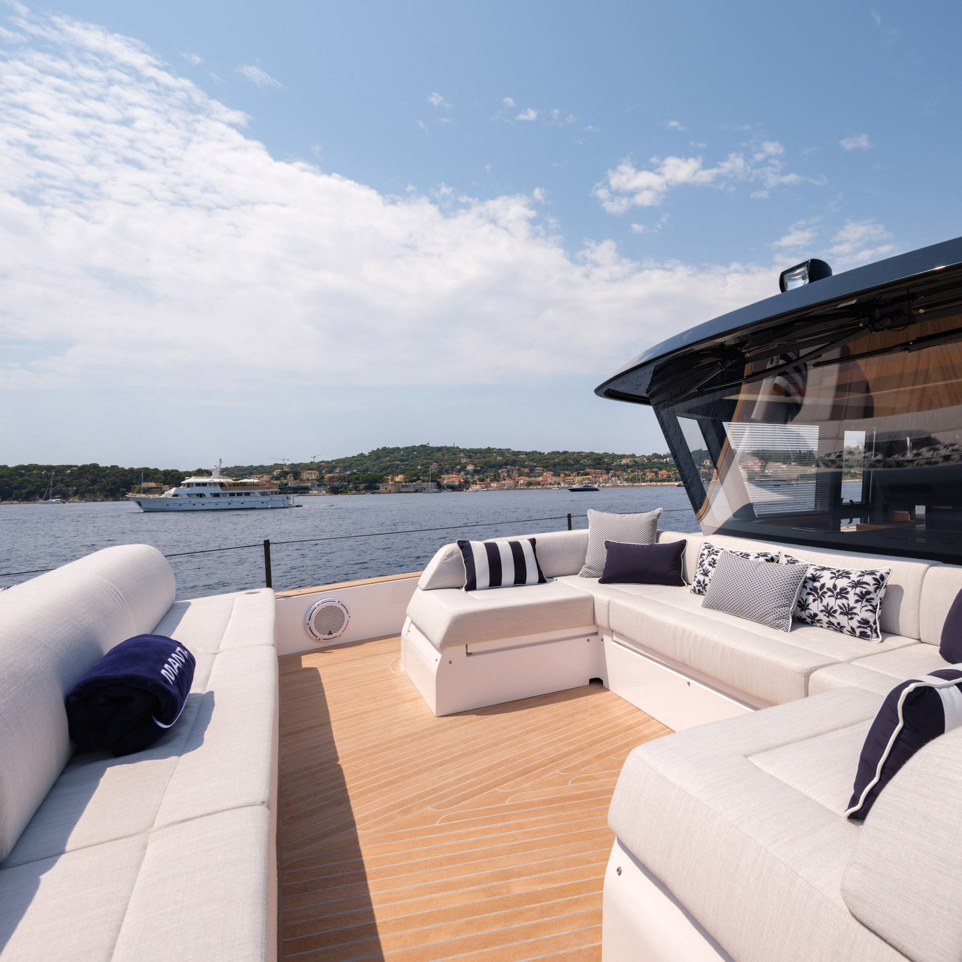 The comfortable seating area can be complemented by a central table, making the bow lounge perfect for breakfasts or aperitifs with a sea view.