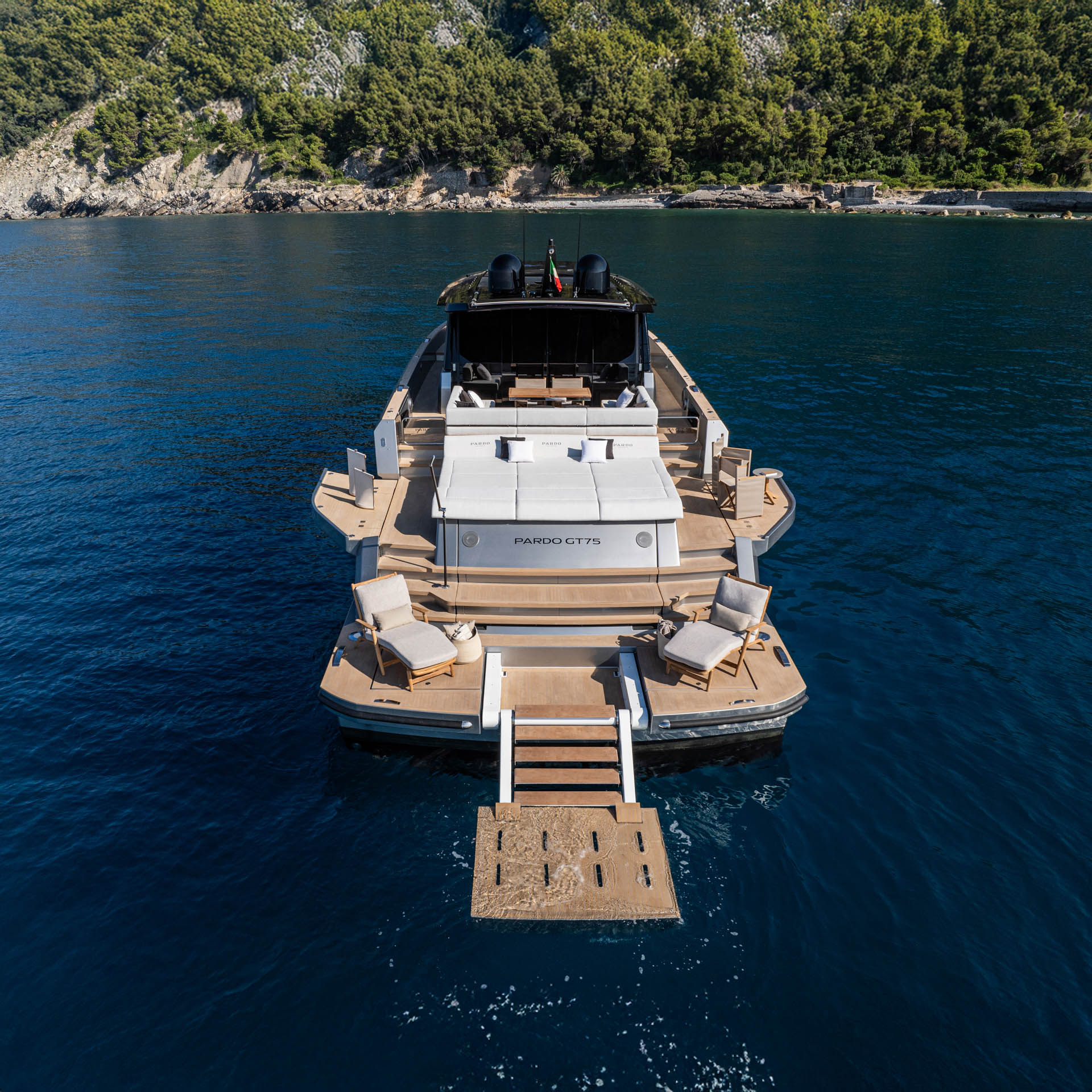 As the flagship of the GT series, the Pardo GT 75 embodies nearly 23 meters of superyacht-quality living. Designed for owners who seek an unparalleled, exclusive, and fully customizable experience at sea, the GT 75 redefines the art of yachting. Meticulous attention to interior volumes creates harmonious and functional indoor spaces, offered with multiple layout options – galley up or galley down – flowing effortlessly into the refined outdoor areas on the main deck. At the same time, the high-performance hull design of this 75-foot yacht delivers thrilling navigation, ease of maneuverability, and fuel efficiency. To minimize its environmental impact, the engine room is set up to accommodate hybrid engine options. The GT 75 perfectly embodies the signature characteristics of its range: seamlessly blending the dynamic spirit of the walkaround models with the spaciousness of the endurance line. It redefines the paradigms of luxury yachting while staying true to Pardo Yachts’ iconic design elements, such as the reverse bow and clean, timeless lines.