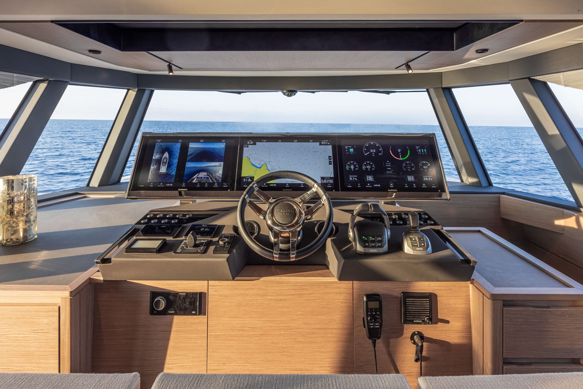 The GT75's interior helm station, featuring large screens and surrounded by wide windows, offers exceptional maneuvering visibility.