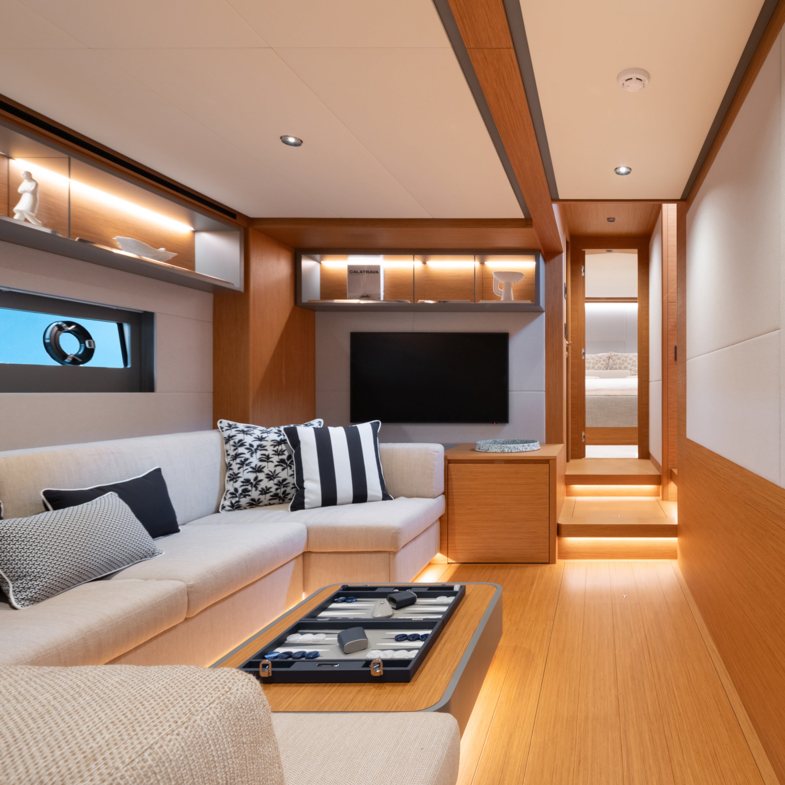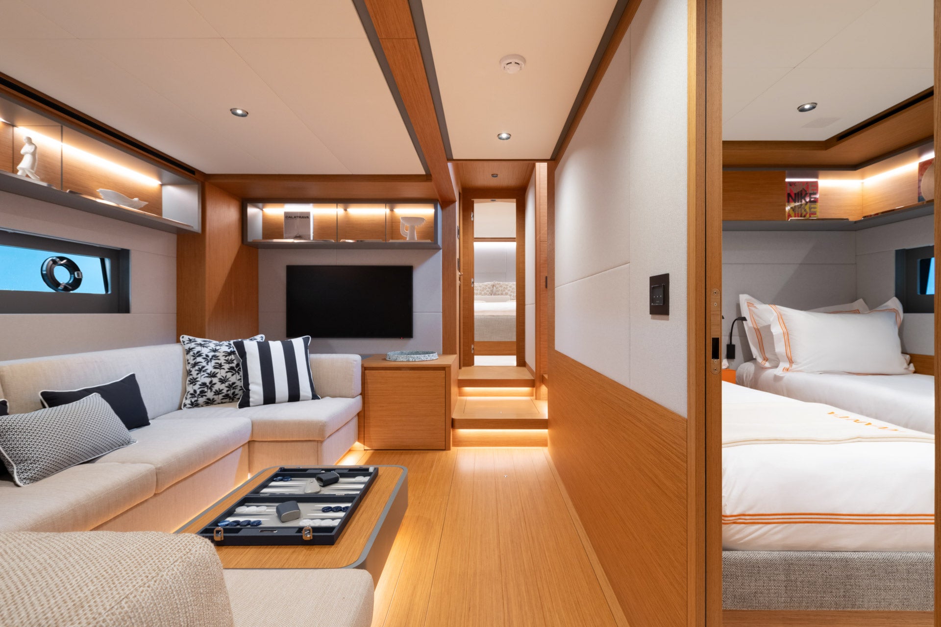 Descending below deck, you are welcomed by a living area with a C-shaped sofa and flat-screen TV, designed as the hub around which the cabins are distributed.
