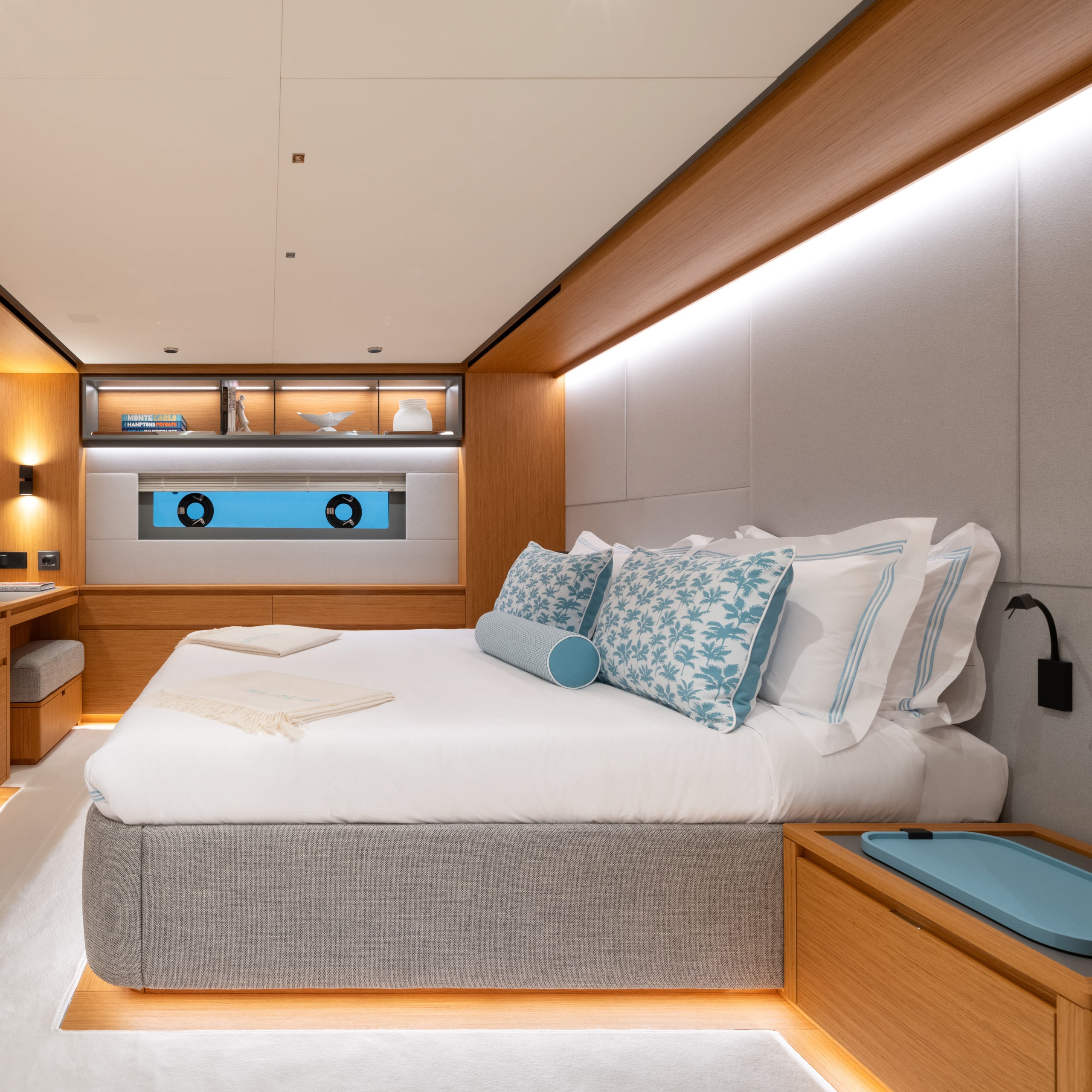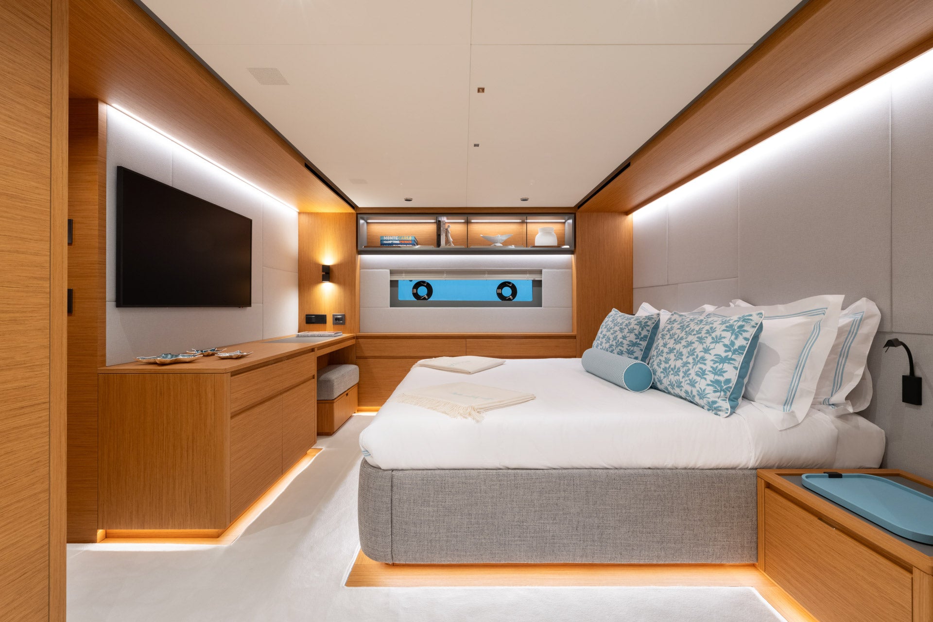 In the VIP cabin, the flat-screen TV opposite the bed allows guests to carve out a private relaxation space, surrounded by warm teak finishes.