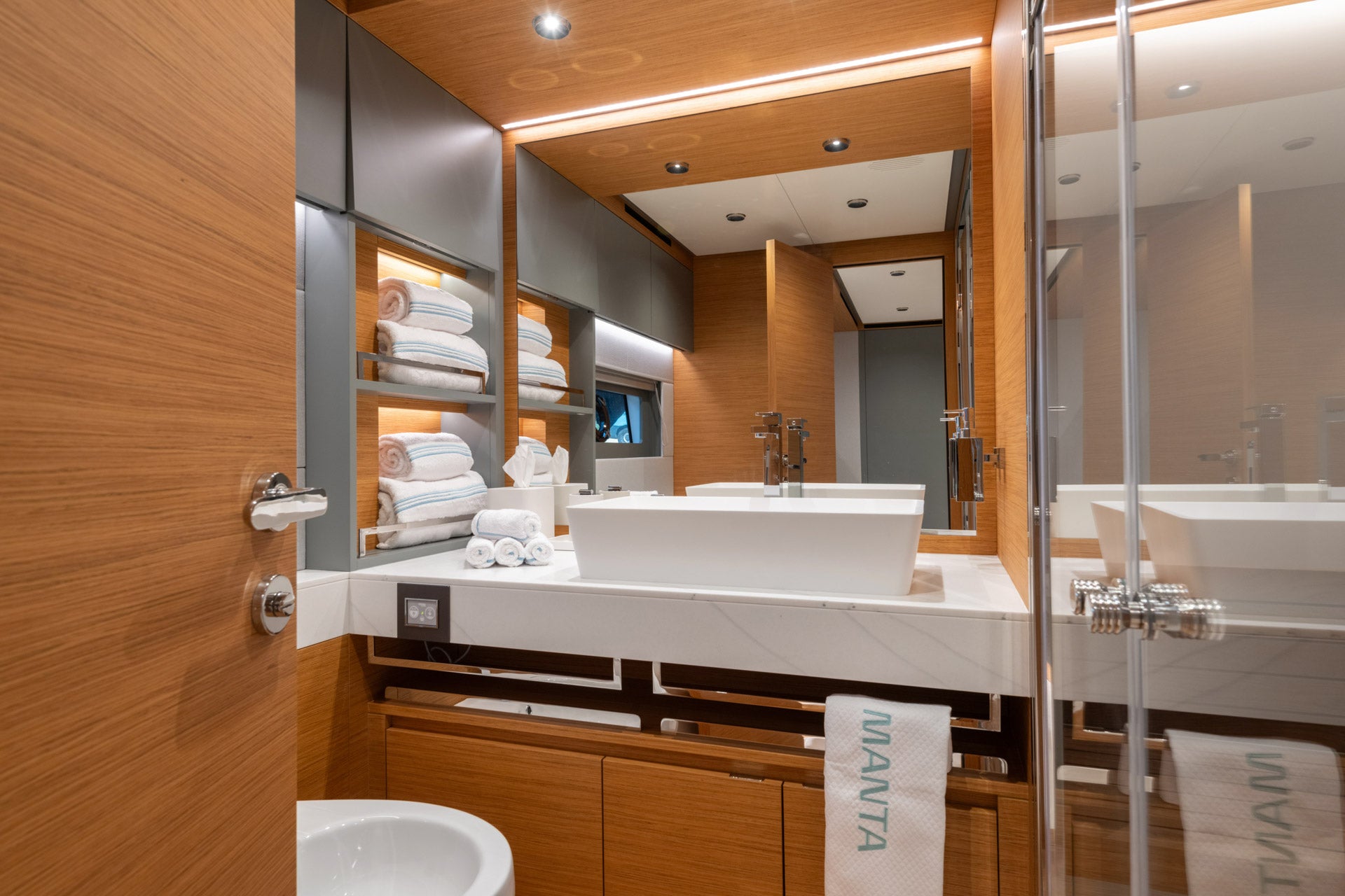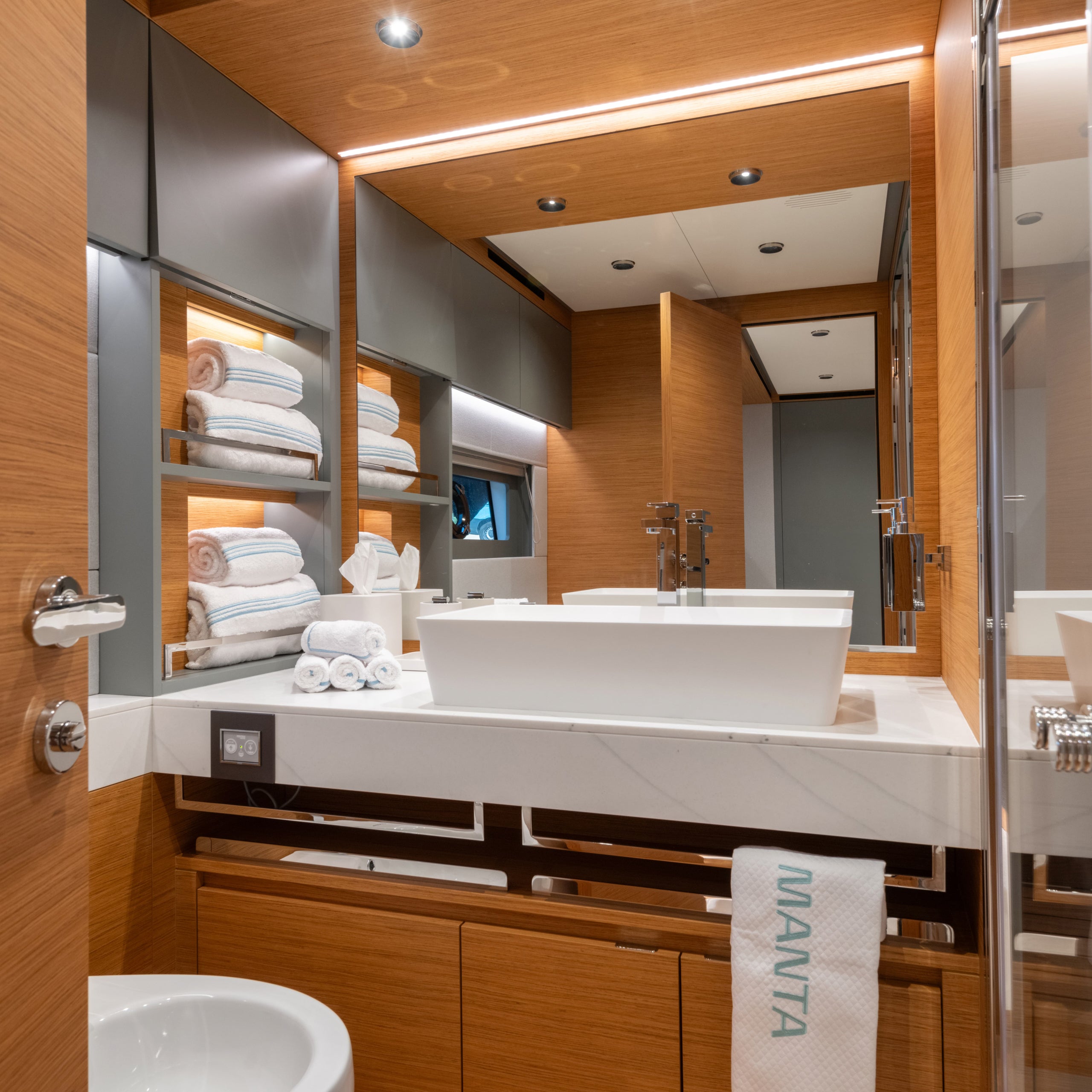 Functional design, refined details, and clean lines: the private bathroom of the VIP cabin reflects the stylistic imprint found throughout the interiors.
