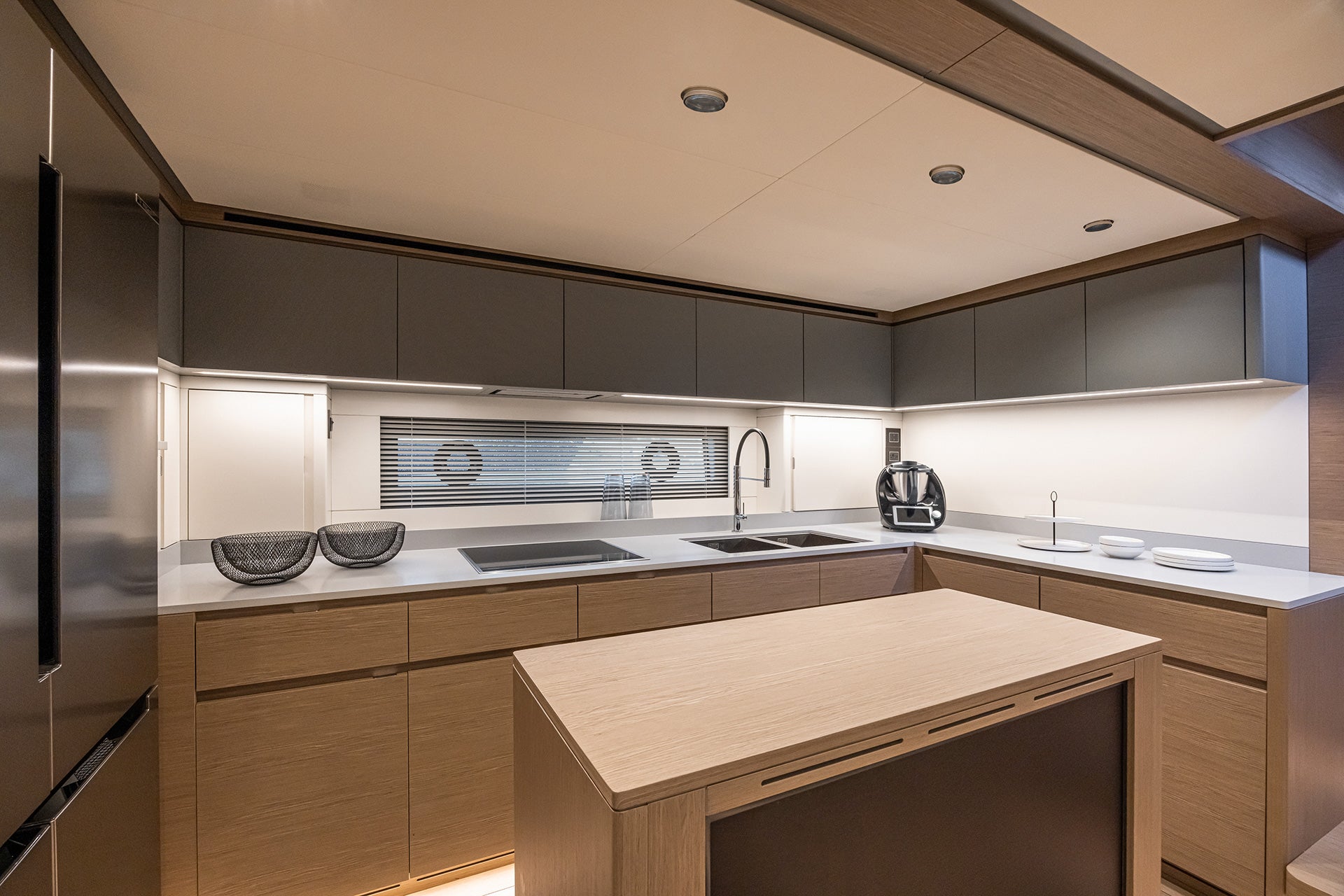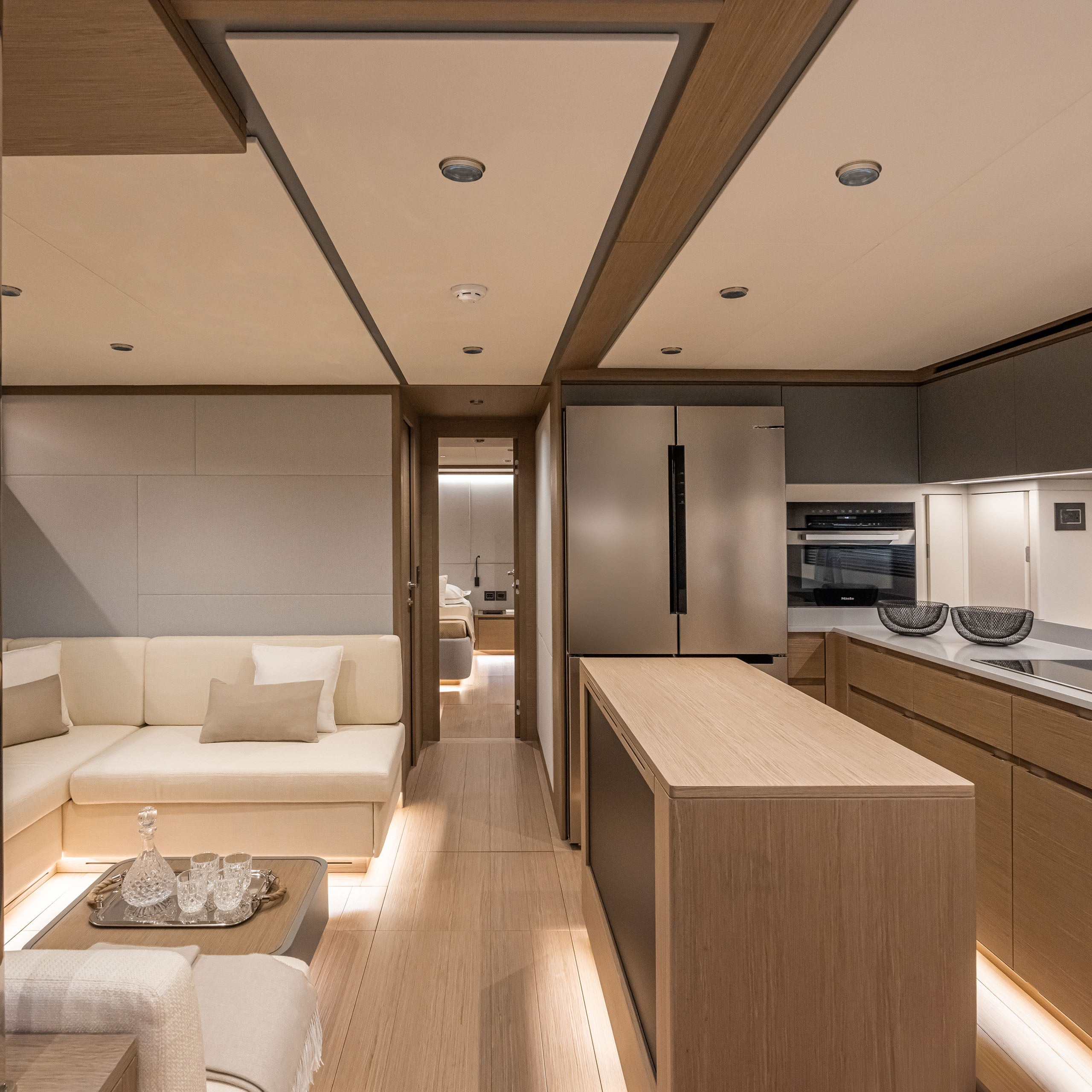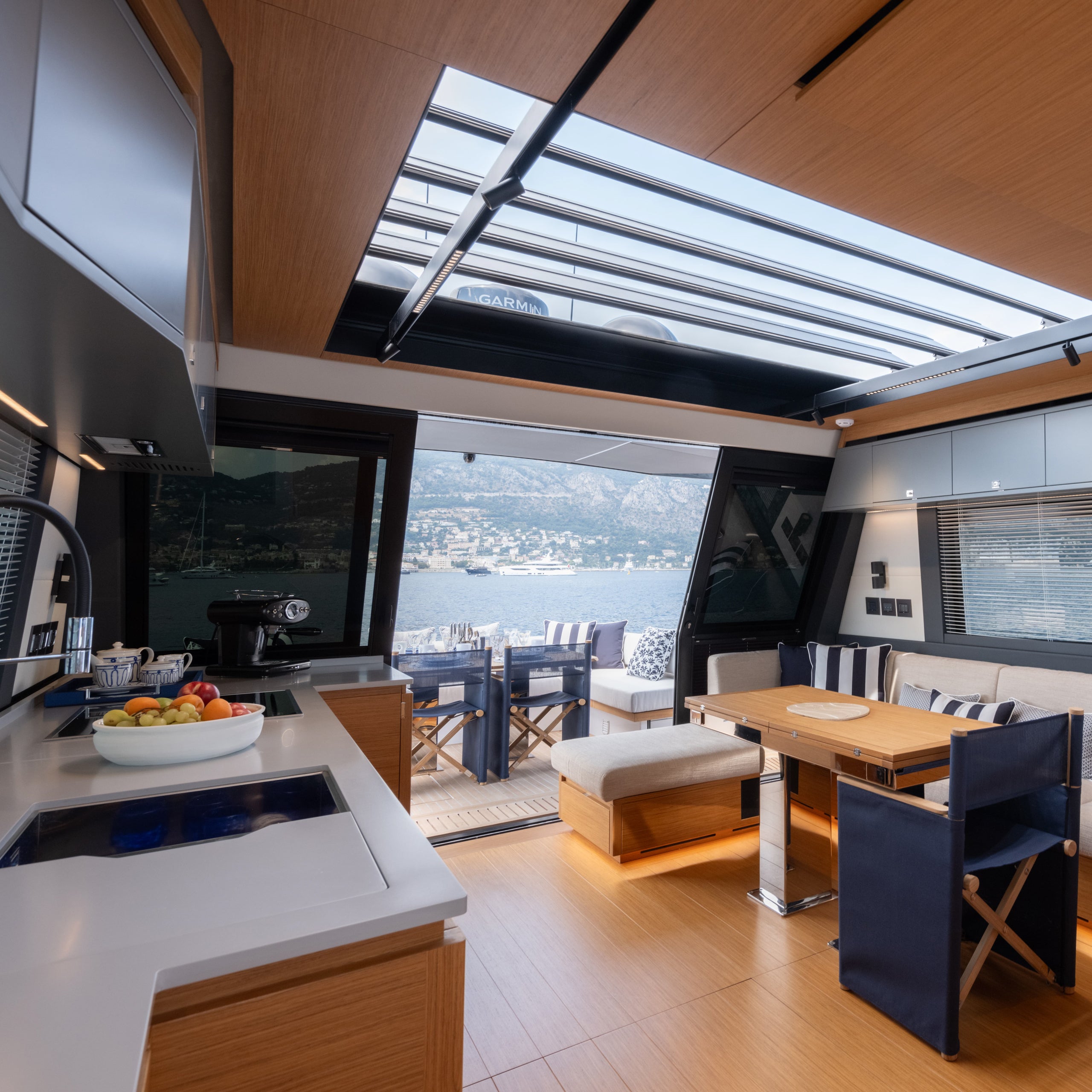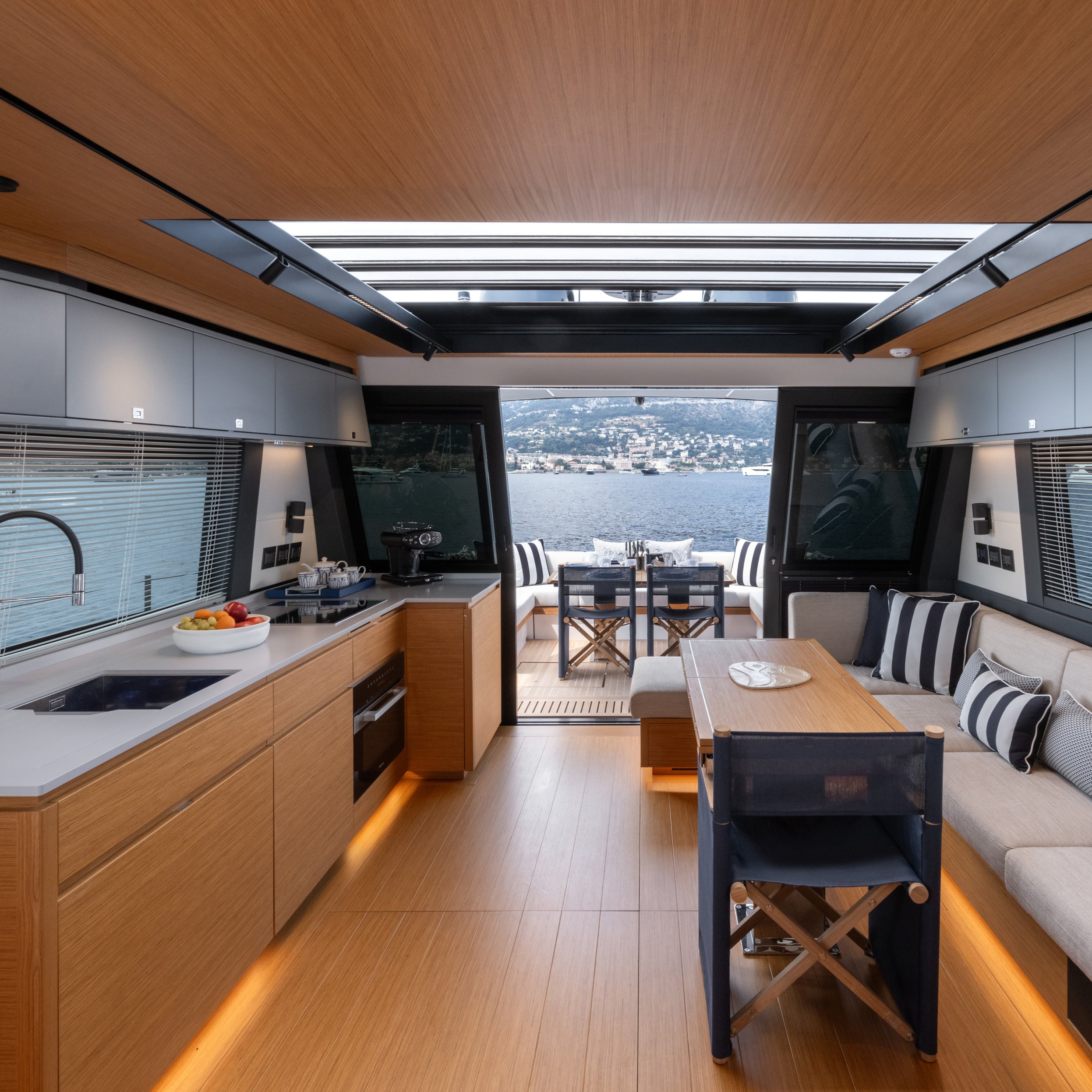 In the galley down layout, designed for excellent year-round livability of common areas, the lower deck features a full-beam lounge with kitchen, overlooking the sea through two large windows.