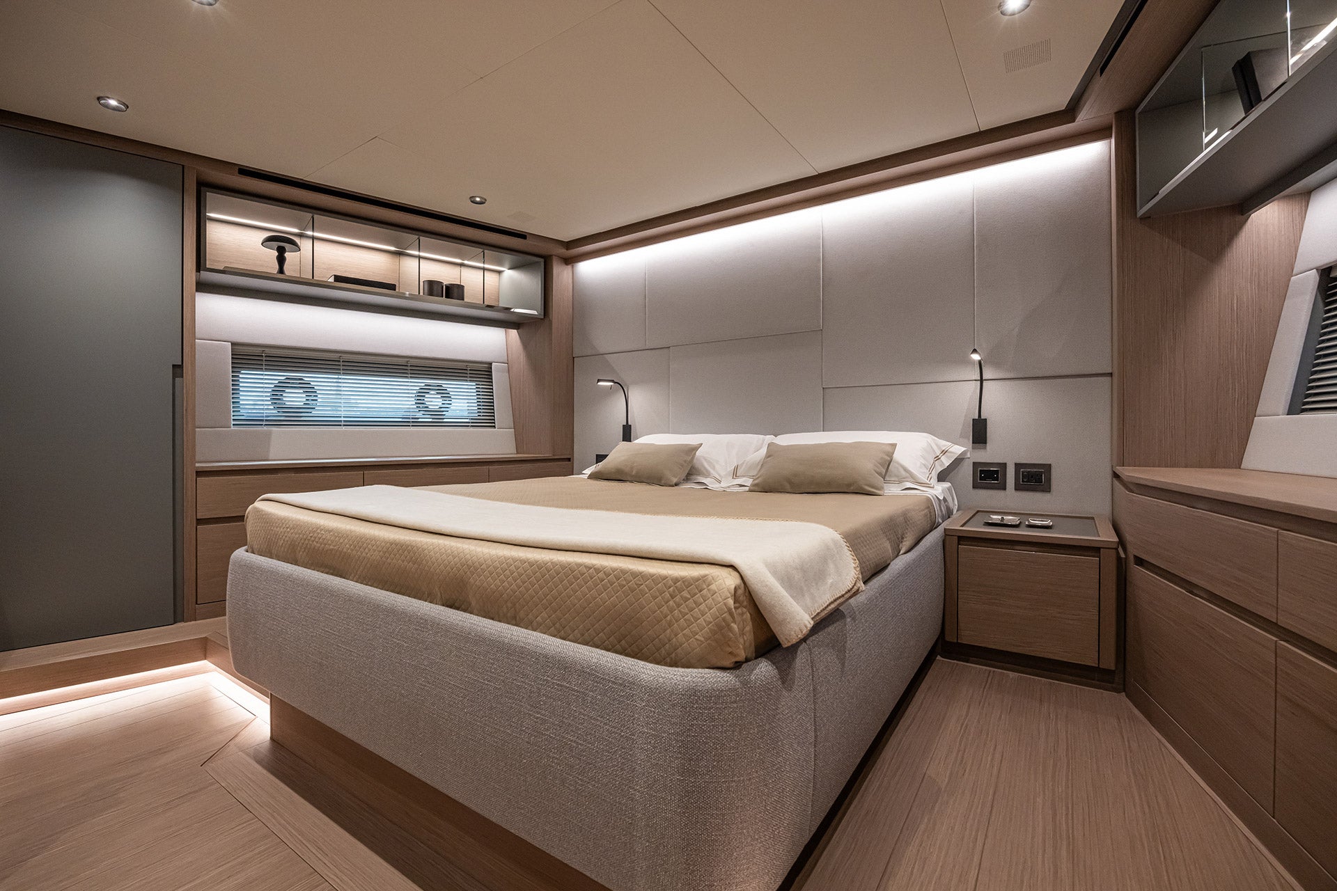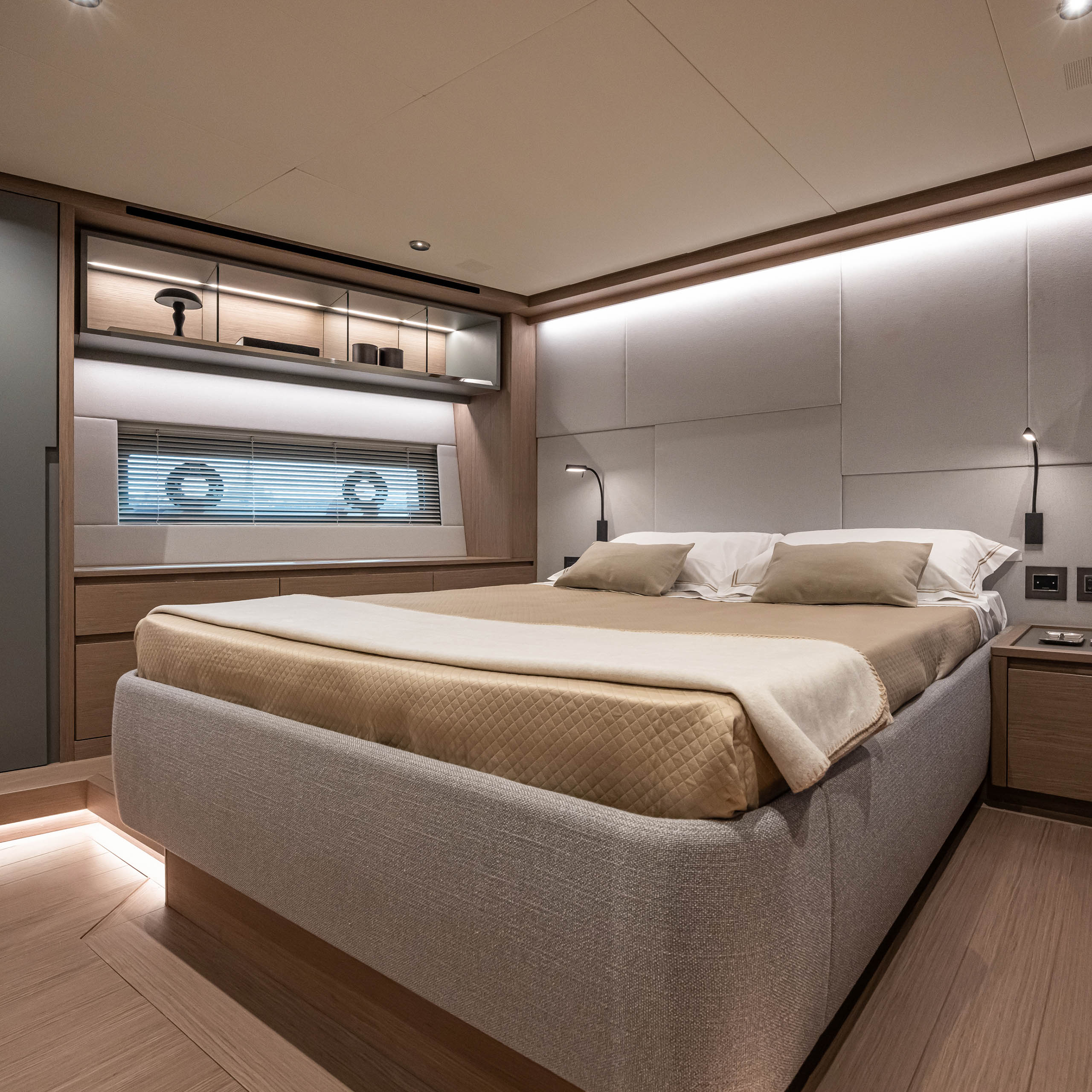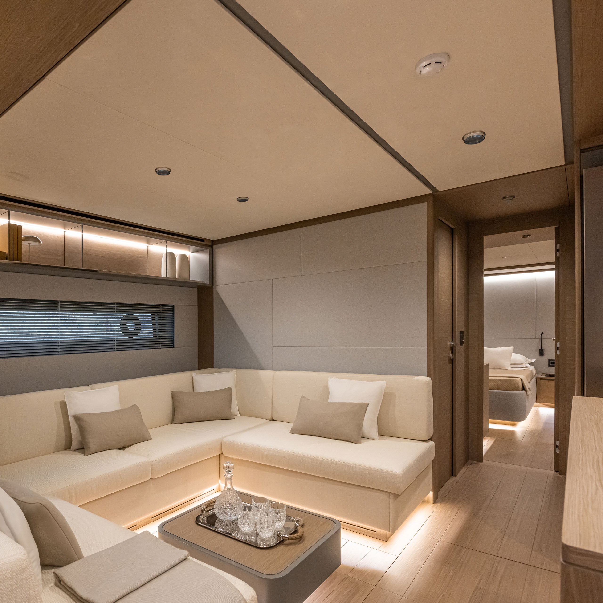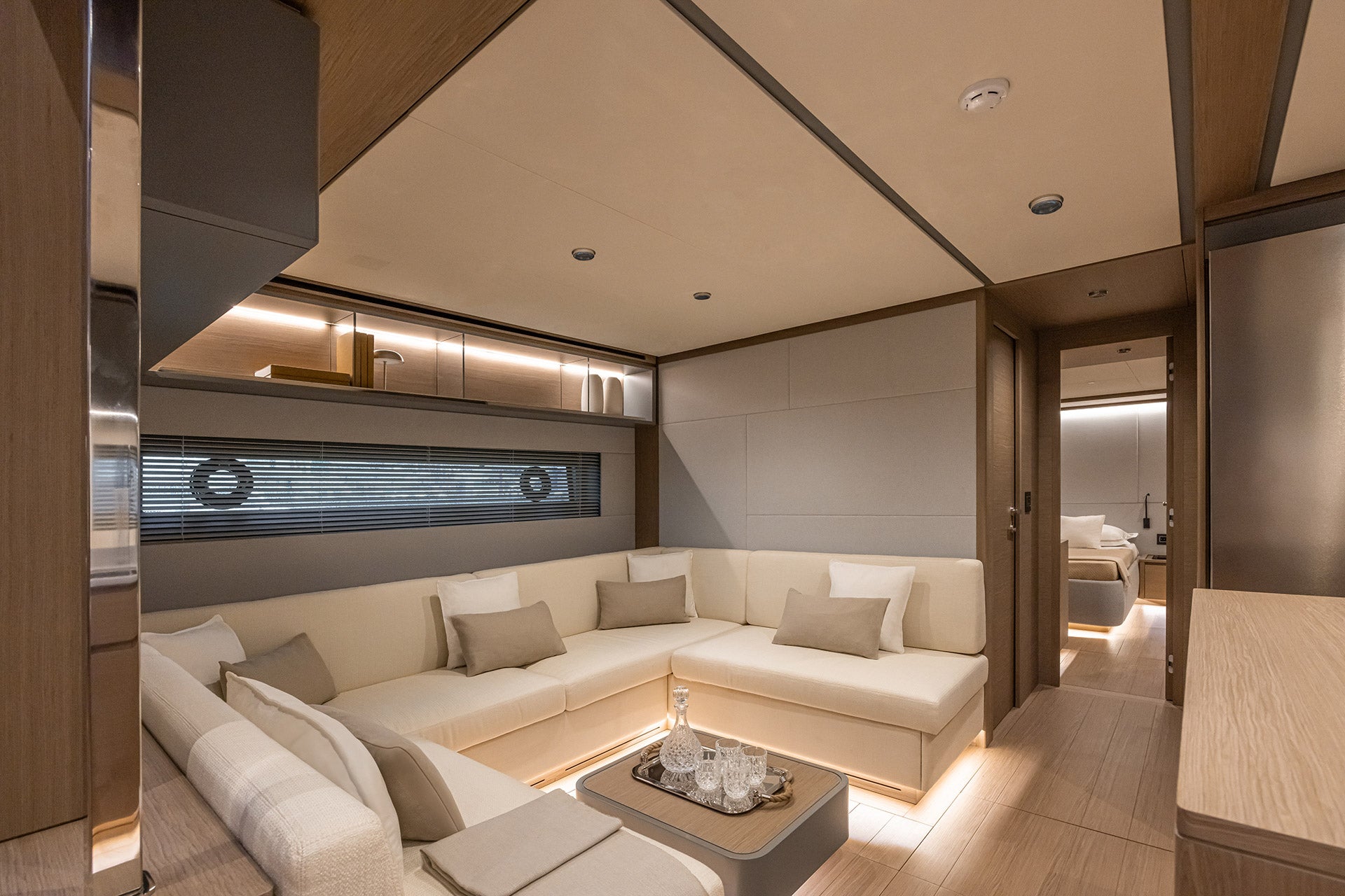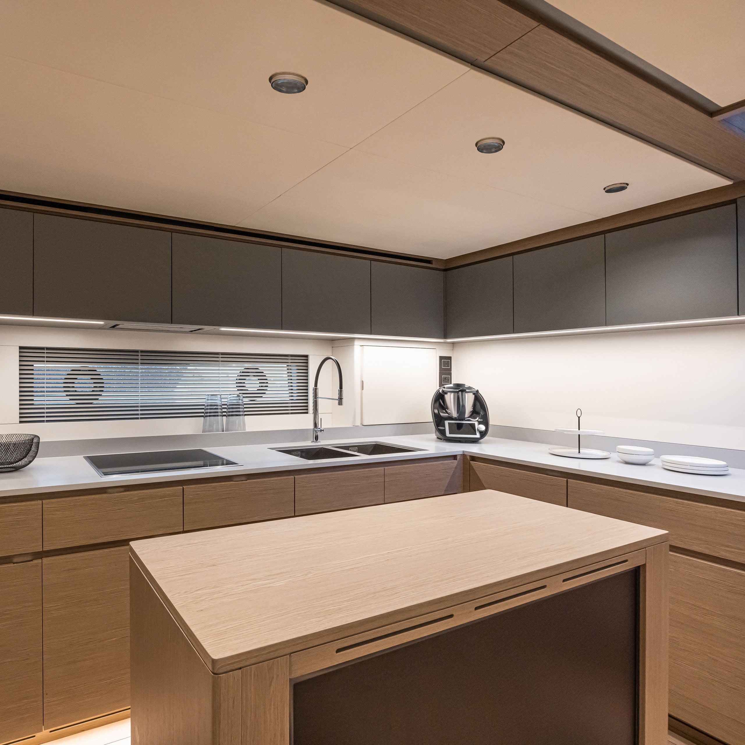 In the galley down layout, designed for excellent year-round livability of common areas, the lower deck features a full-beam lounge with kitchen, overlooking the sea through two large windows.