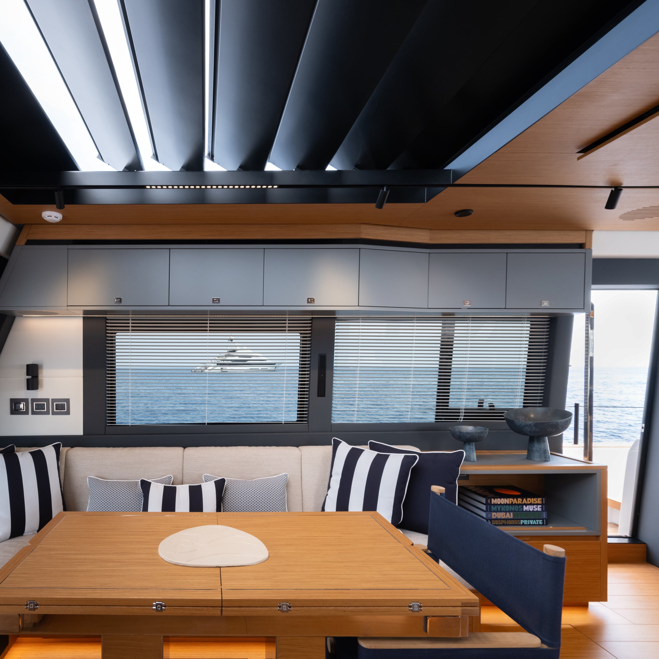Through the open glass doors and the retracted roof, the interior seamlessly merges with the cockpit lounge, creating a natural flow between indoor and outdoor spaces.