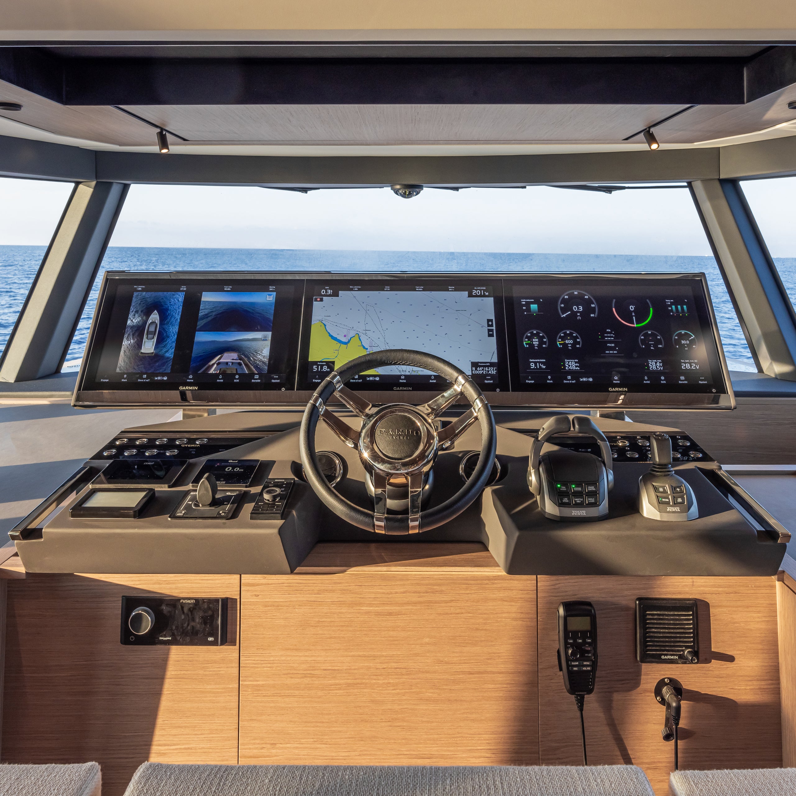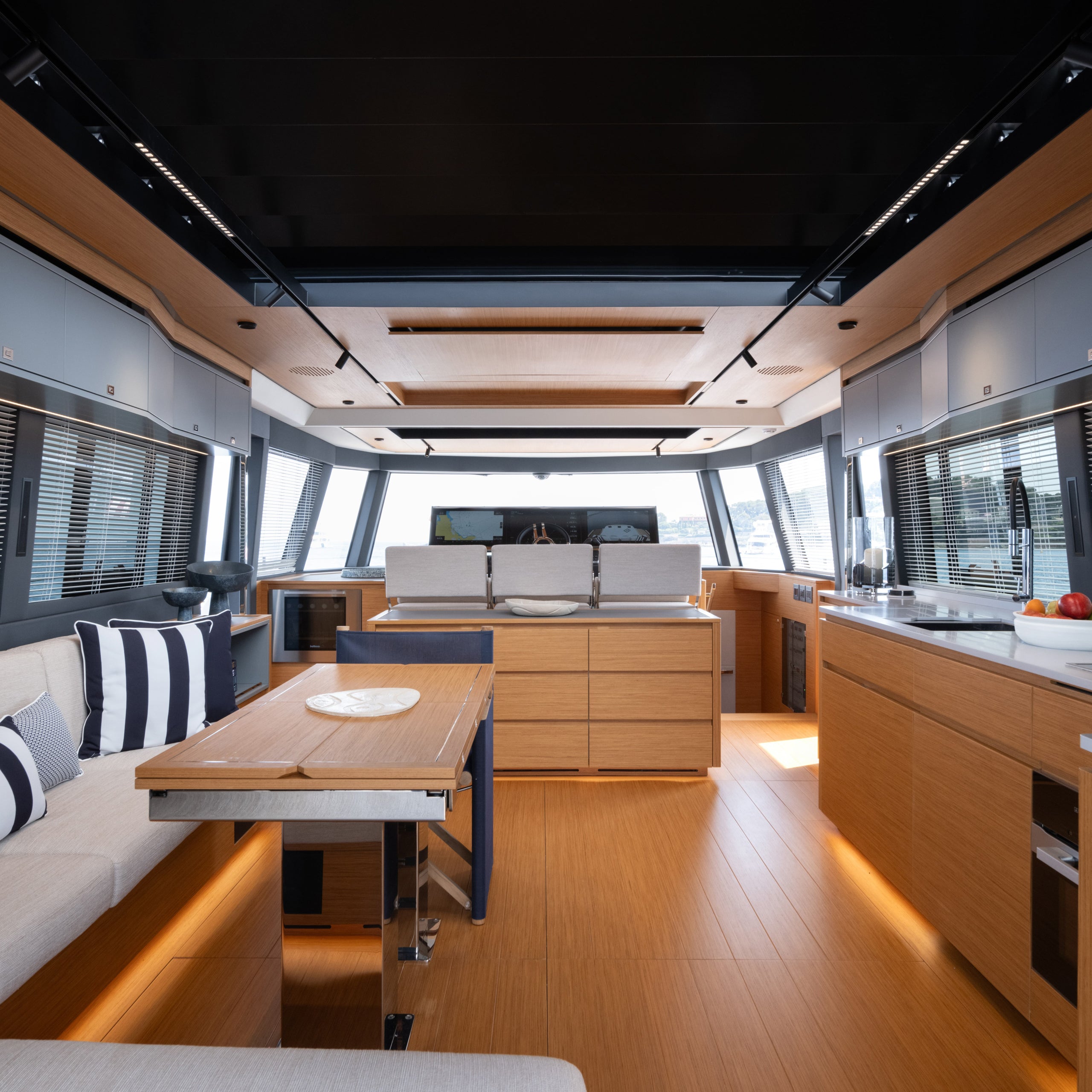 The helm station, equipped with three seats, integrates perfectly into the saloon setting.