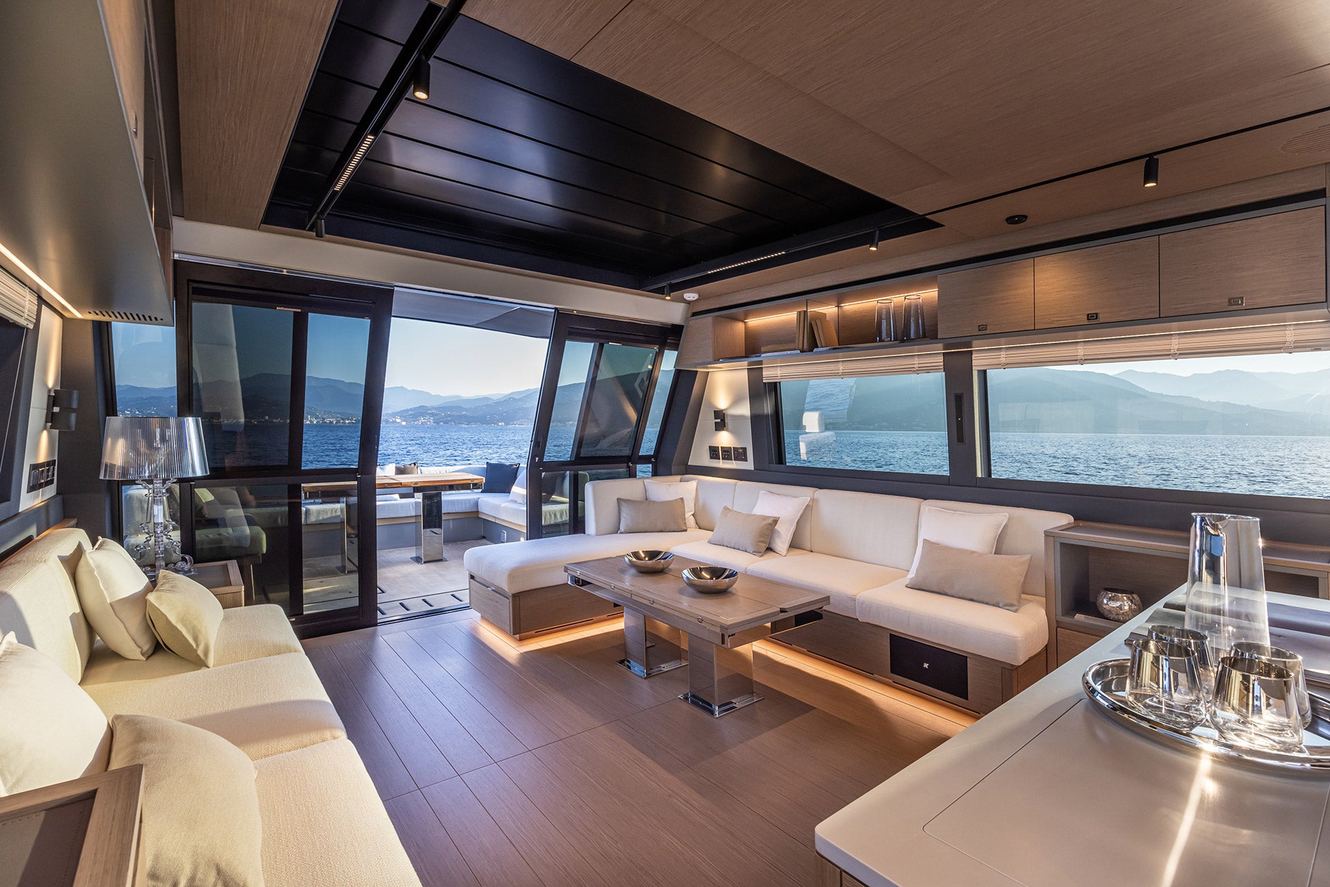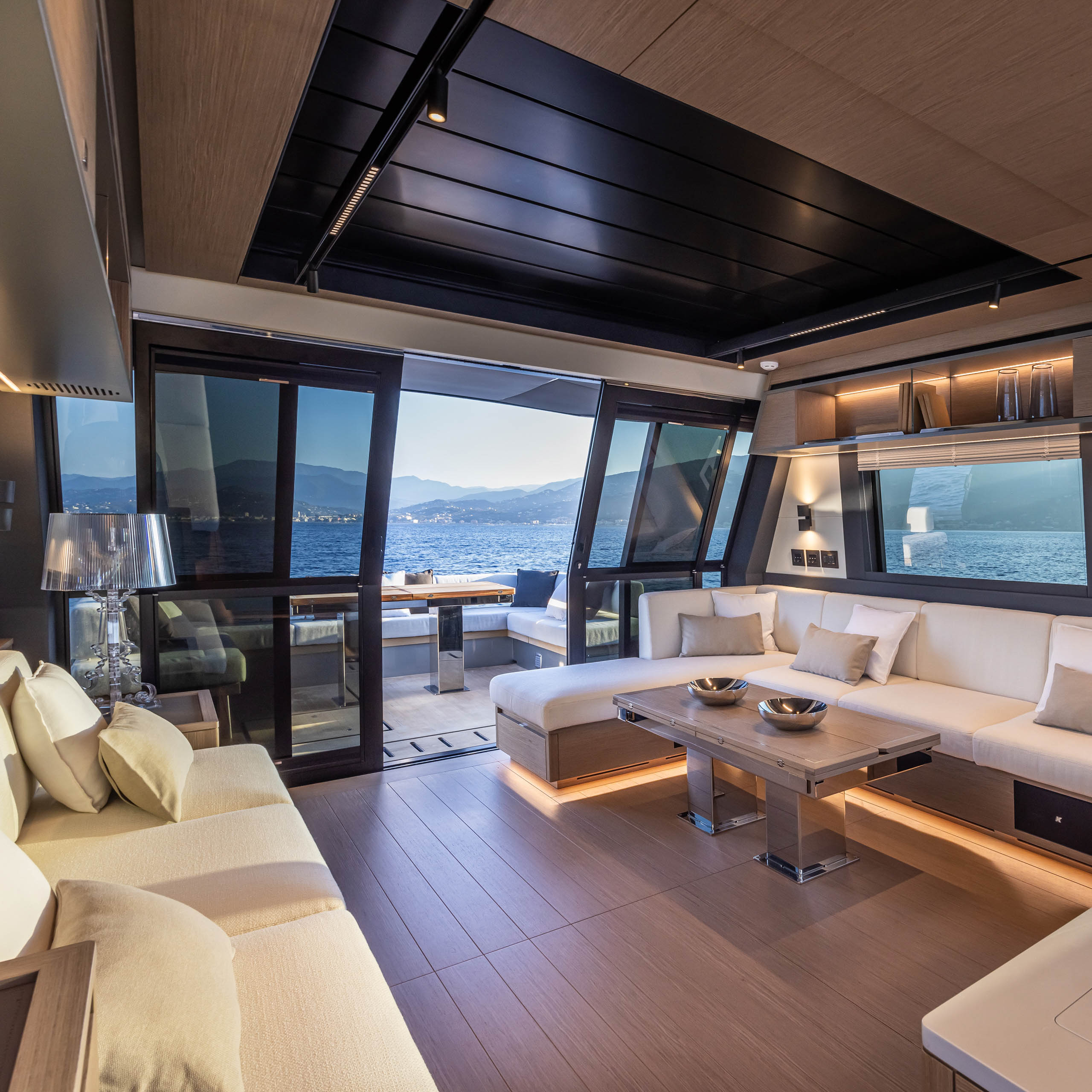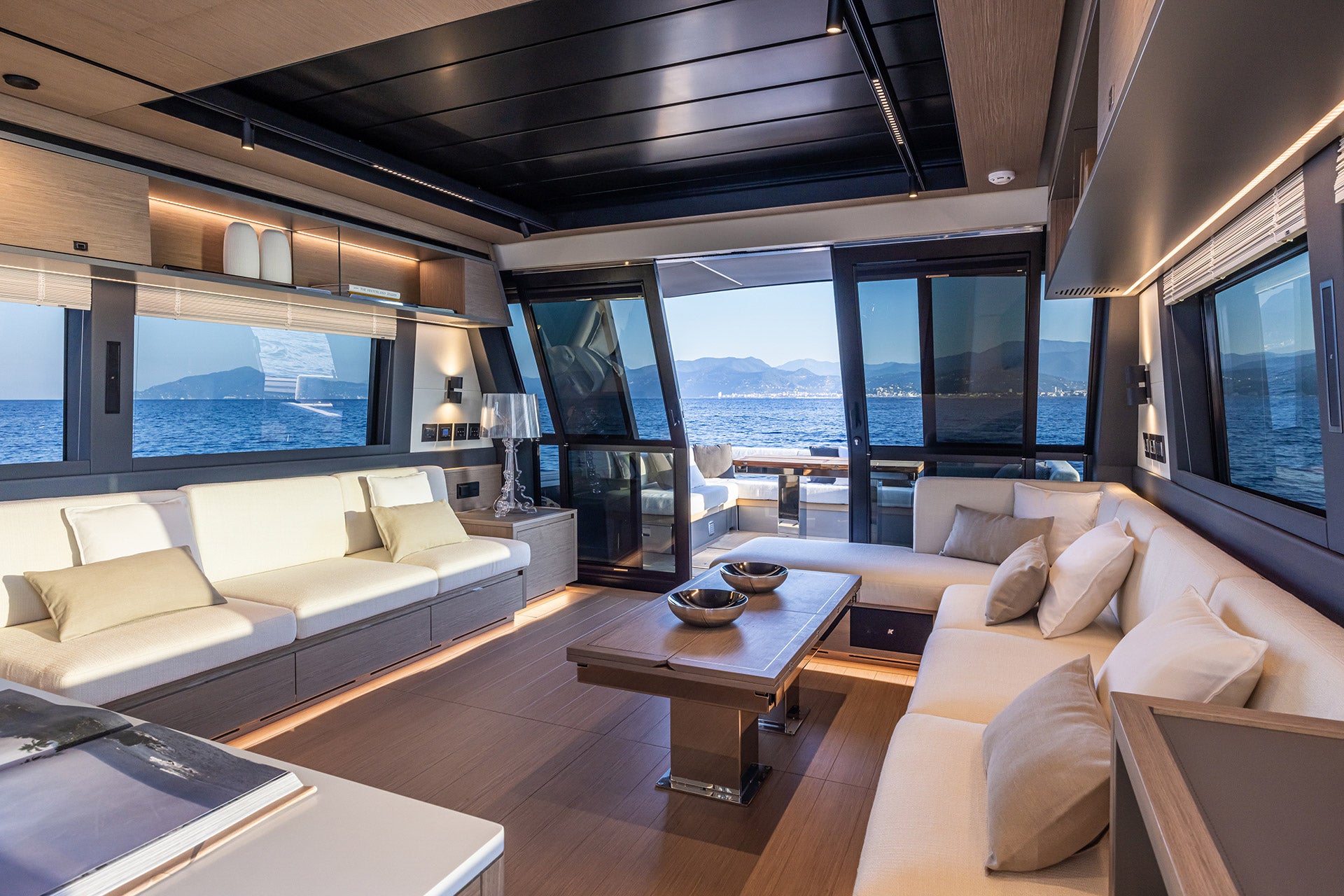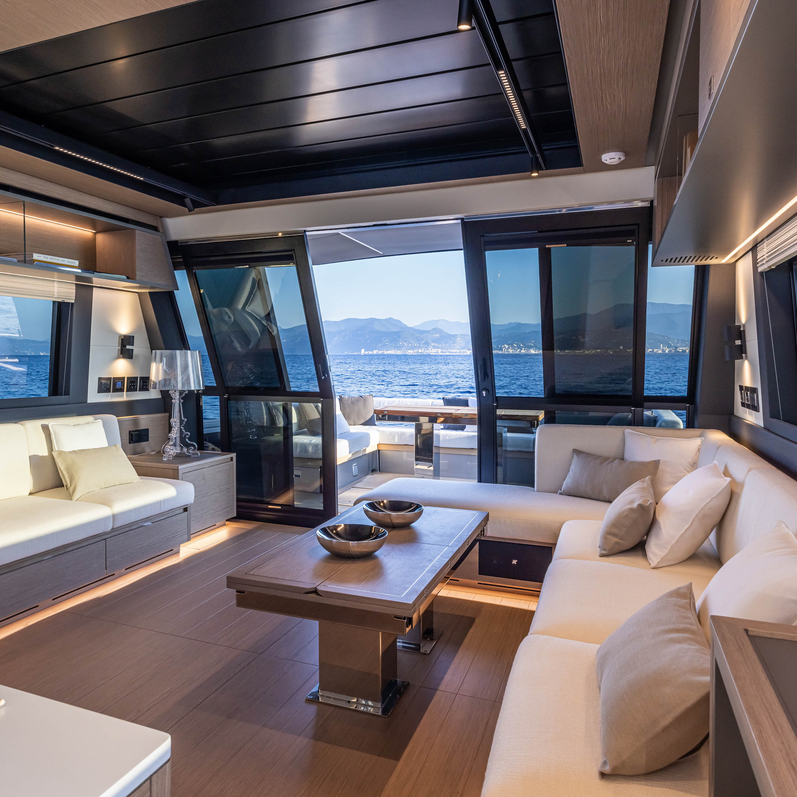 The main deck living area, in the galley down version, is an expansive lounge offering uninterrupted sea views.